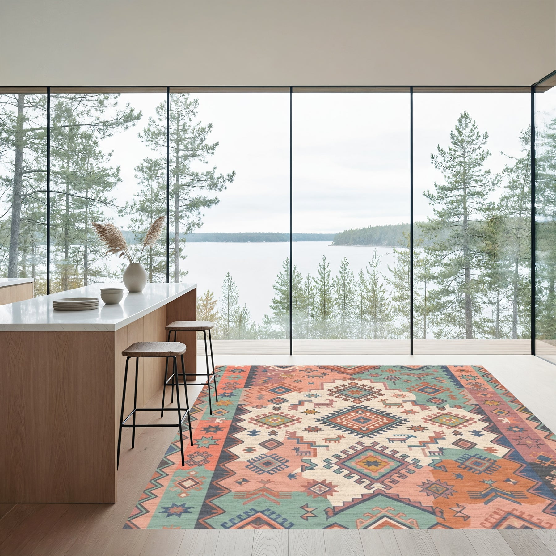 Flatwoven High Traffic Area Rug, Terracotta Teal Geometric Animal Medallion Rug, Non Slip, Stain Resistant, Washable Area Rugs for Living Room, Bedroom Overview: