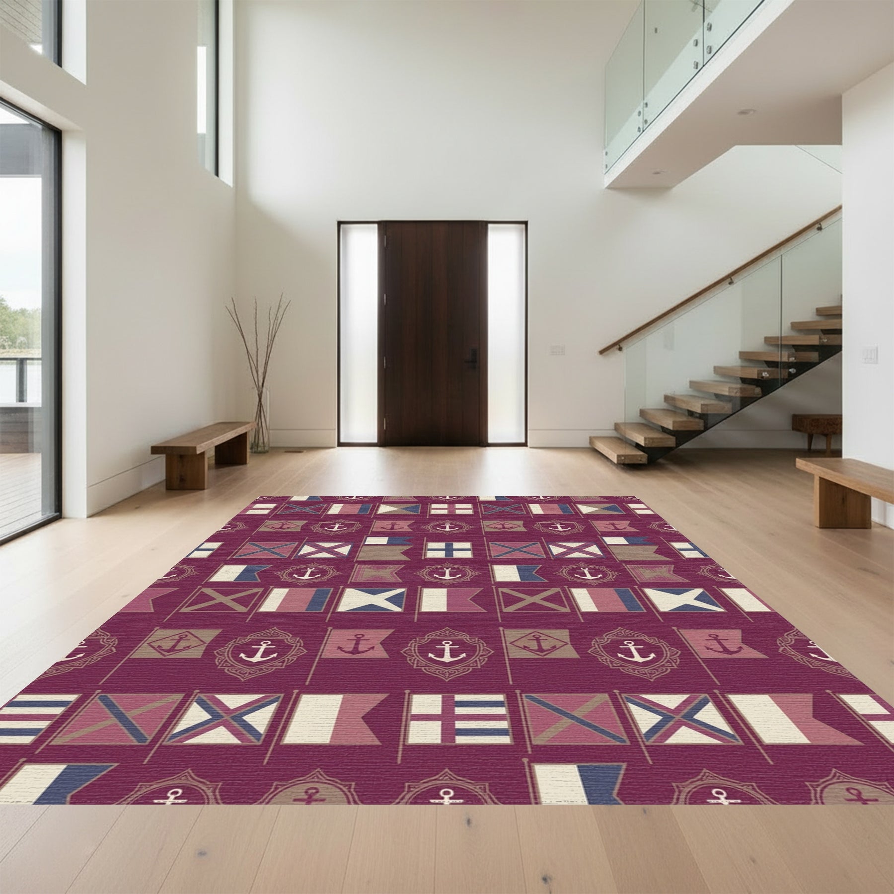 Flatwoven High Traffic Area Rug, Nautical Flags Crimson Anchor Collage Rug, Non Slip, Stain Resistant, Washable Area Rugs for Living Room, Bedroom Overview: