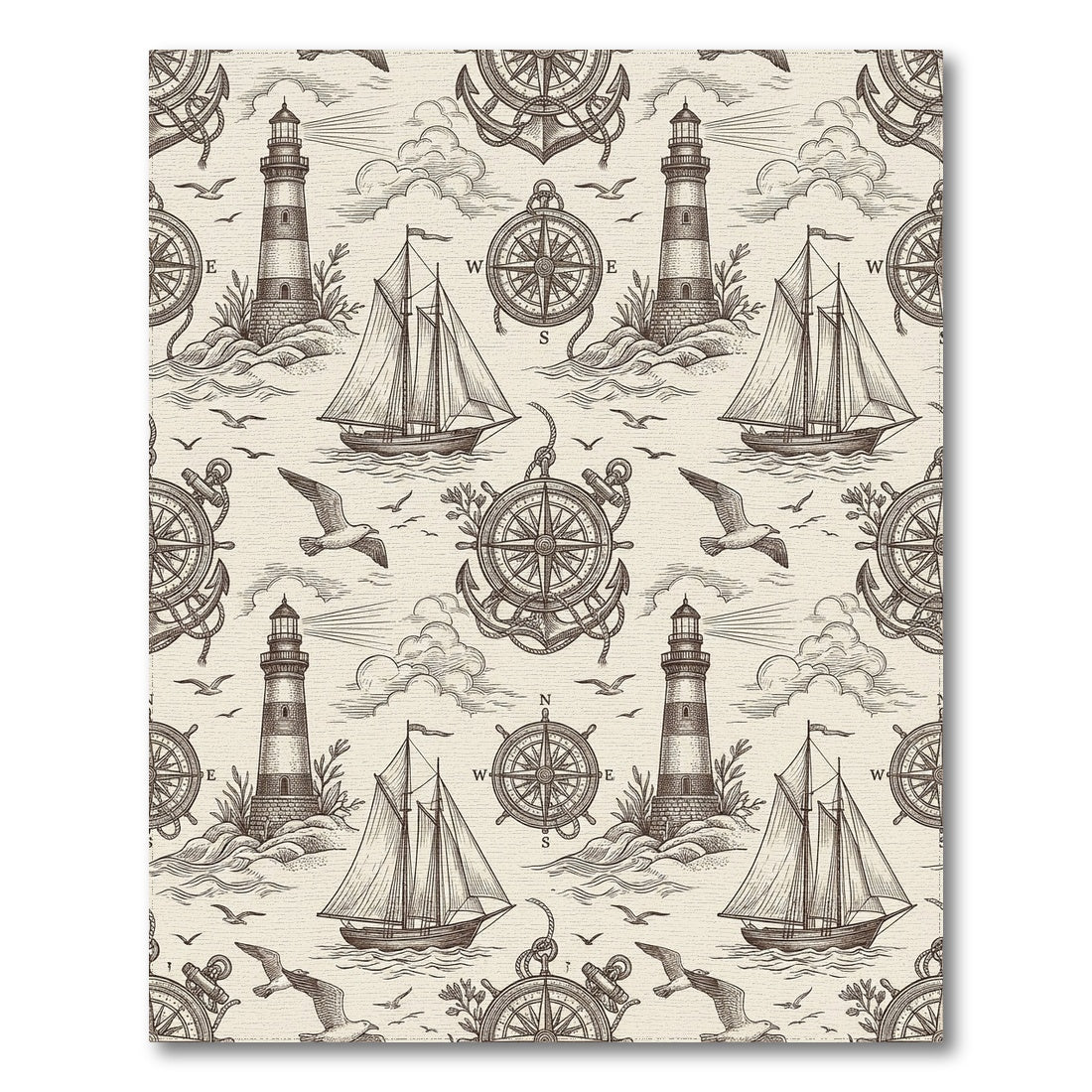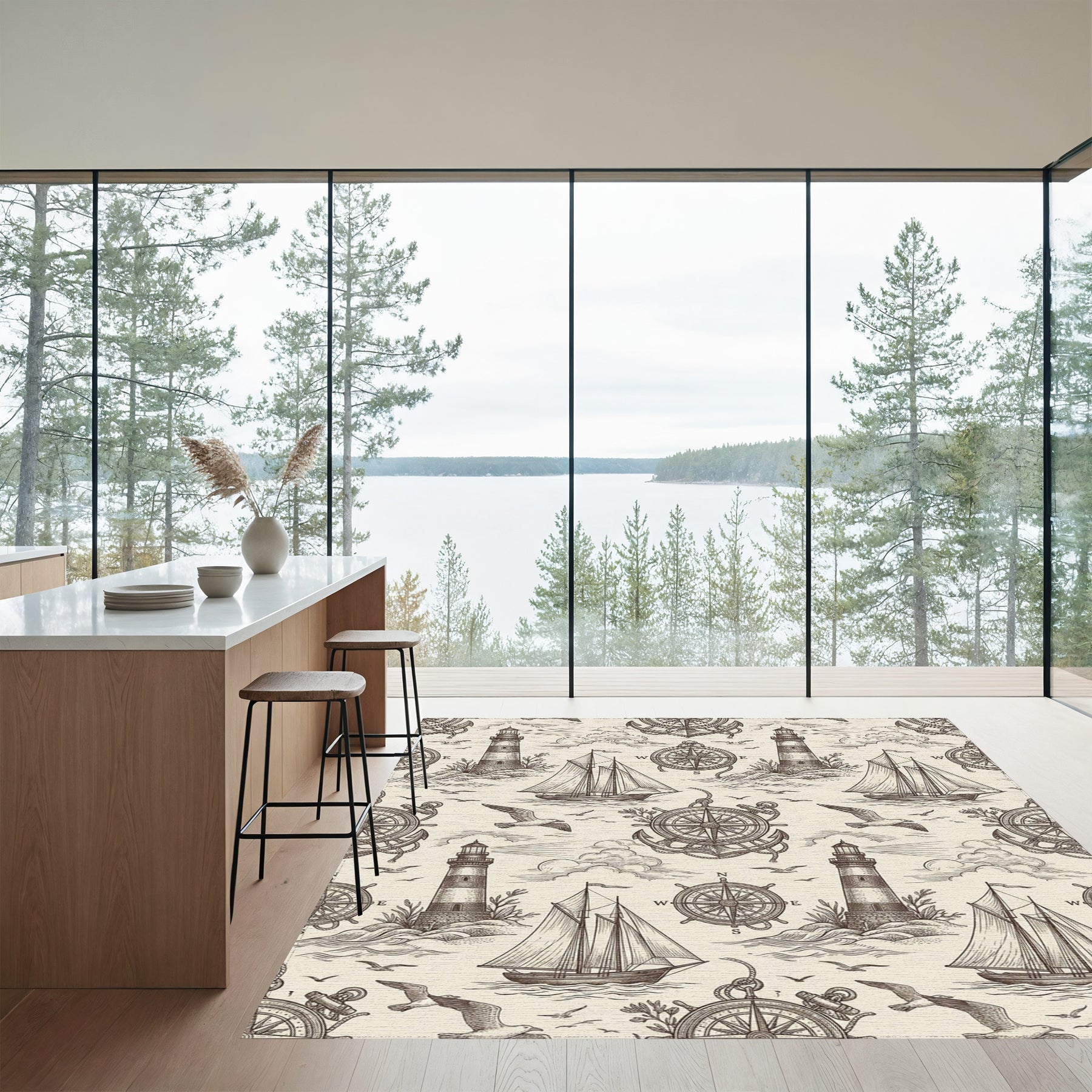 Flatwoven High Traffic Area Rug, Nautical Sketch Lighthouse Sailboat Compass Seagull Rug, Non Slip, Stain Resistant, Washable Area Rugs for Living Room, Bedroom Overview:
