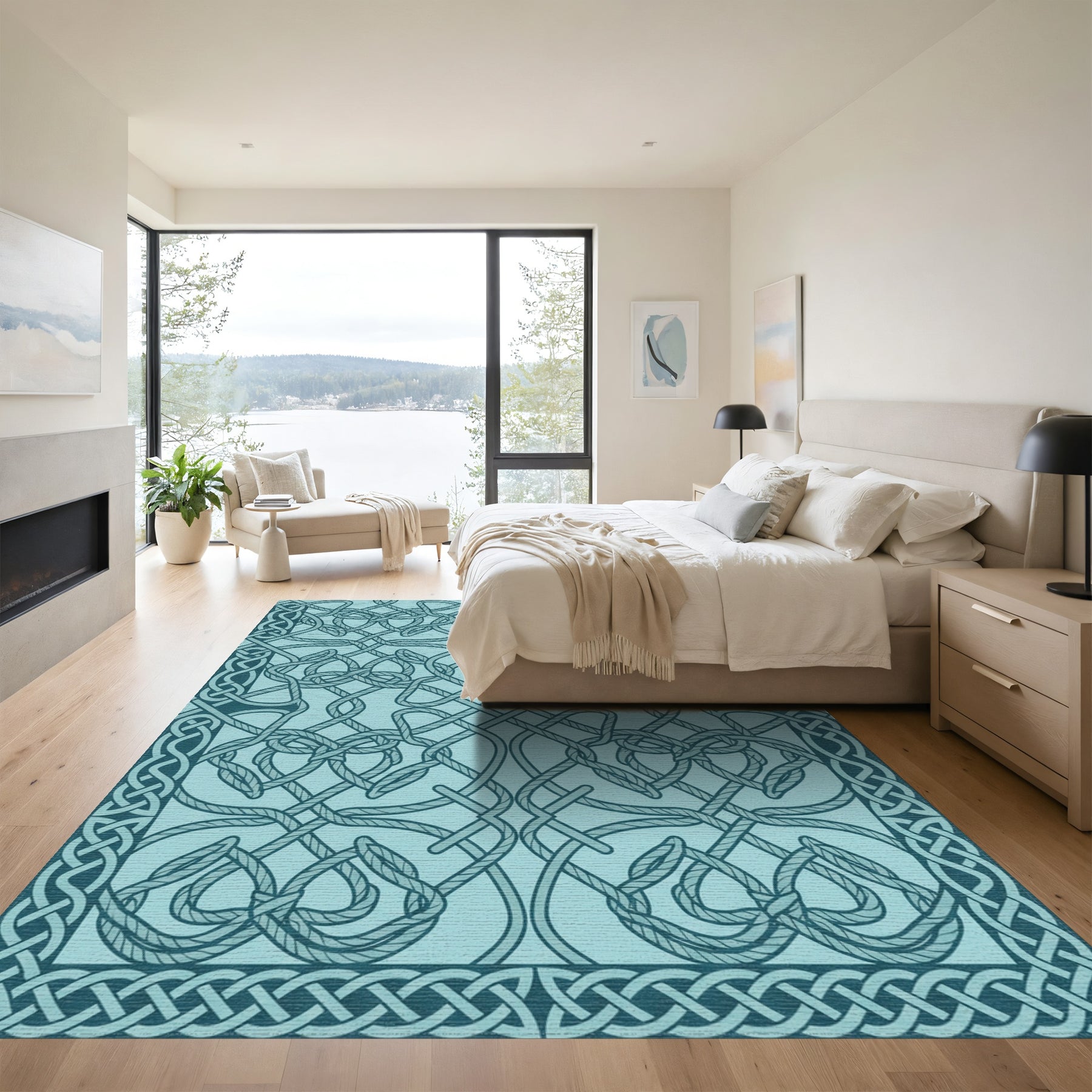 Flatwoven High Traffic Area Rug, Teal Intricate Knotwork Border Rug, Non Slip, Stain Resistant, Washable Area Rugs for Living Room, Bedroom Overview: