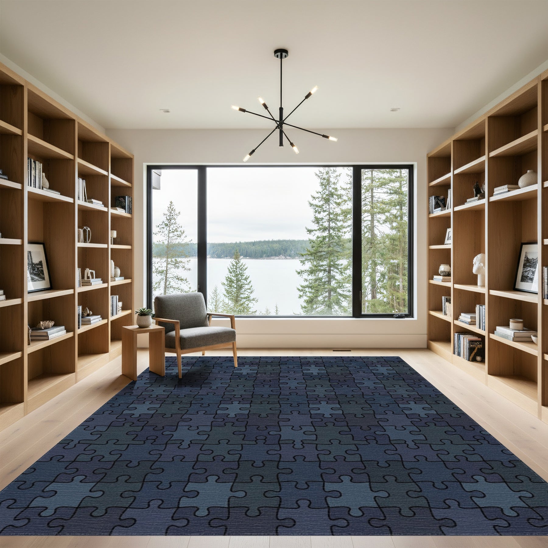 Rooted in the mid-century modern obsession with modularity and kinetic art, this design pays homage to the intellectual puzzles of the Bauhaus tradition, reimagined for the contemporary home. The puzzle piece motif ripples across the surface like fragments of a midnight sky, creating a rhythmic, dark-toned geometry that feels both intellectual and deeply grounding. By interlocking soft, shadowy shades of navy and sky, the rug functions less like a floor covering and more like a meditative grid for the modern dwelling. Step onto it and watch the room coalesce; sharp lines blur into soft comfort, turning the floor into a cohesive anchor for your sanctuary. For the heart-led curator who appreciates the beauty in how individual pieces form a greater whole, this is not a rug—it is a conversation about connection. Walk upon this logic, and let your home become a place of thoughtful, quiet wonder.