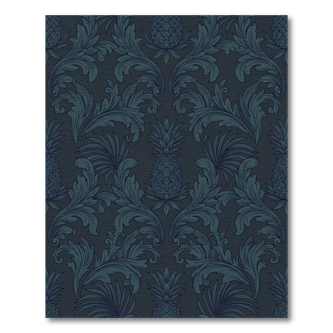 Drawing from the rich lineage of 18th-century European damask and the colonial-era preoccupation with tropical botany, this design reimagines the classic pineapple as a symbol of hounded luxury. The pattern is a visual feast, where sweeping, ink-blue acanthus leaves unfurl like smoke against a deep, seawater-hued background, framing pineapples that echo the storied elegance of traditional textile art. It is a piece that feels both ancestral and refreshingly modern, reminiscent of transatlantic trade routes and the romantic mystery of dimly lit, velvet-draped parlors. Step onto this scene, and the room shifts, trading stark brightness for hushed, contemplative depth. For the homebuilder who thrives on nuance and drama, this is not a mere floor covering; it is a declaration of sophisticated sanctuary. Don't just fill your space—anchor it in a legacy of quiet, curated drama. Live in reverence of beauty that rewards a lingering gaze.