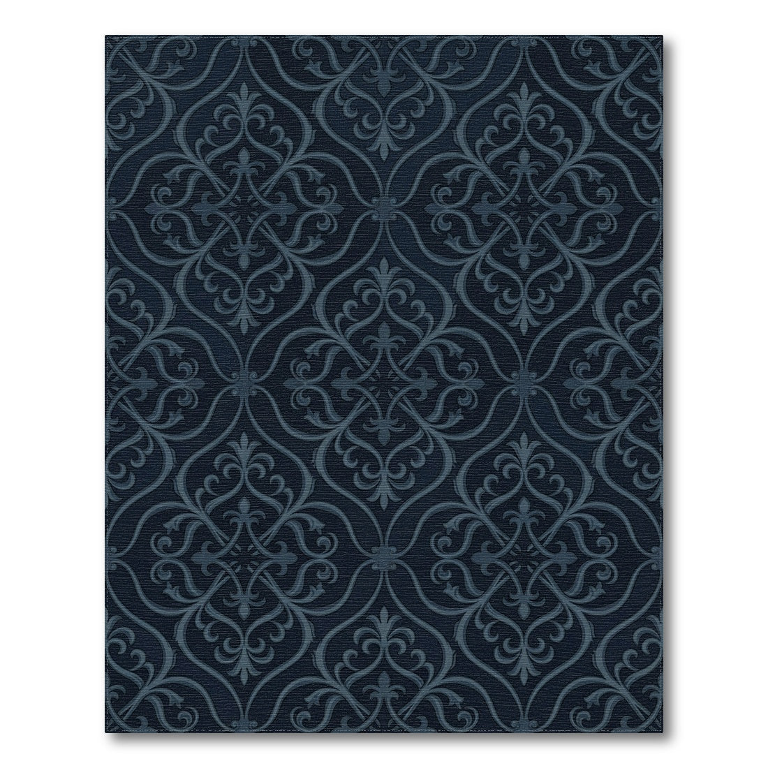 Drawing from the regal lineage of European textile heritage, this design reimagines the timeless damask motif with a contemporary, moody sensibility. The intricate, swirling vines invoke the hallowed artistry of Renaissance-era woven tapestries, yet the monochromatic navy palette lends it a modern, architectural weight. It is as if the silhouettes of formal garden lattices have been captured in the cooling dusk, resting in quiet, shadowy resonance. The repeating pattern creates a rhythmic, meditative flow, turning the simple act of crossing a room into a grounded, storied experience. When you lay this piece down, the floor ceases to be merely a surface—it becomes a foundation of calm, deep drama. For the soul that finds beauty in silence and order in complexity, this is more than decor. It is a declaration of refined taste that anchors the home. Walk upon history, live in grace, and let your space become a testament to the quiet power of tradition.