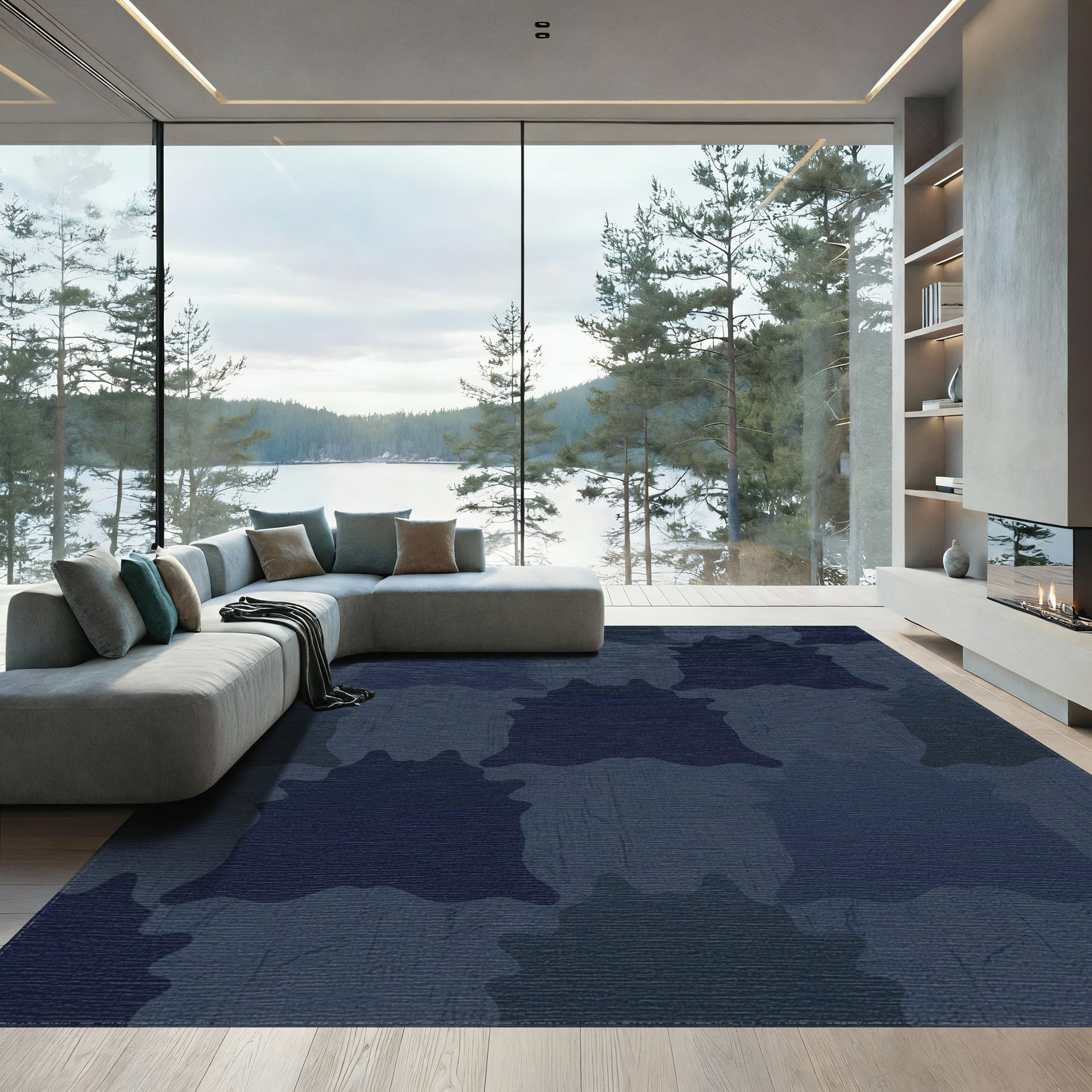 Rooted in the rugged legacy of hide-on-style textiles, this design reimagines the organic silhouettes of traditional animal-inspired decor through a lens of monochromatic minimalism. By isolating the iconic, primal shapes of hides and arranging them into a rhythmic, tessellated pattern, the motif evokes the spirit of Neo-Primitive sophistication. The deep, atmospheric indigo hues act as a sensory anchor, resembling the velvet-soft dark of a midnight sky or the silent weight of a mountain lake at twilight. When placed into a room, the rug transforms the environment; the floor dissolves into a layered, shadow-drenched tapestry that softens architectural edges and invites a sense of hush. It is designed for the seeker of tranquility and the collector of subtle drama—those who prefer their spaces to feel like a curated sanctuary. Step onto this scene, and the room breathes with a new, somber elegance. Live in reverence.
