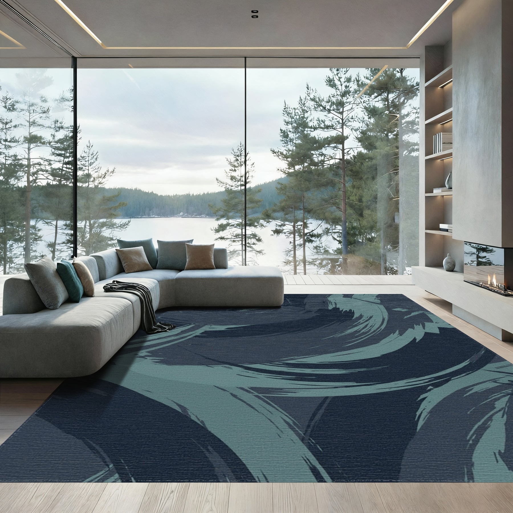 Flatwoven High Traffic Area Rug, Deep Teal Brushstroke Abstract Swirls Rug, Non Slip, Stain Resistant, Washable Area Rugs for Living Room, Bedroom Overview: