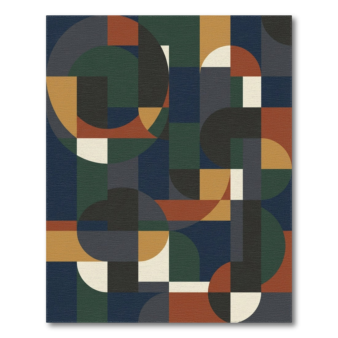 Flatwoven High Traffic Area Rug, Mid Century Circles Squares Ochre Navy Rug, Non Slip, Stain Resistant, Washable Area Rugs for Living Room, Bedroom Overview: