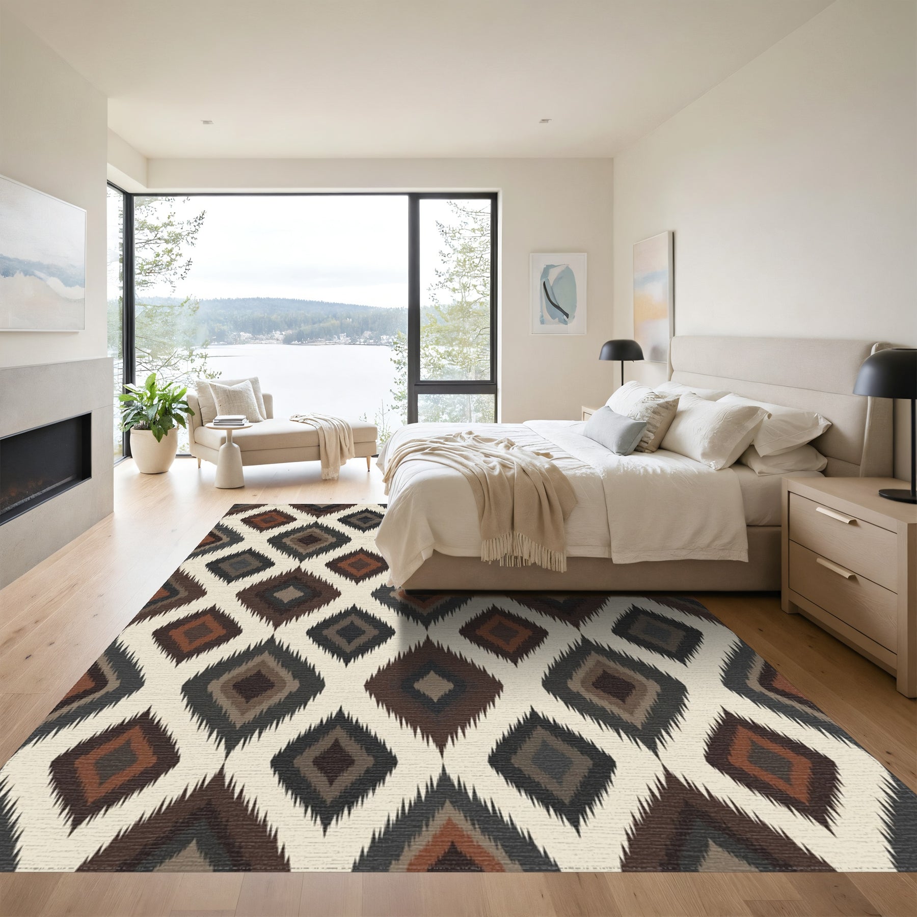 • Modern, artistic: Add a piece of modern charm to your bedroom collection. Designed with the art of minimalism, this rug is sure to provide your bedroom with coziness.