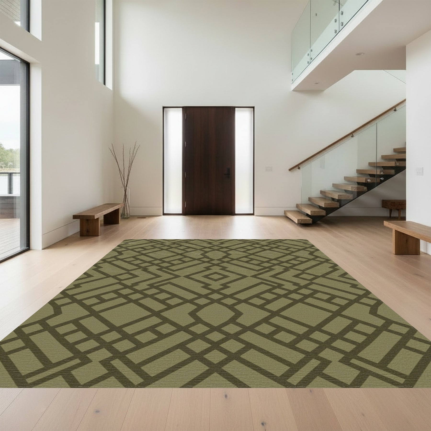 Flatwoven High Traffic Area Rug, Olive Green Interlocking Geometric Lattice Rug, Non Slip, Stain Resistant, Washable Area Rugs for Living Room, Bedroom Overview: