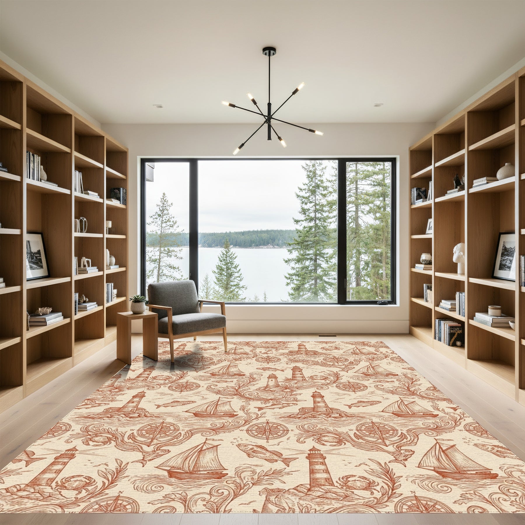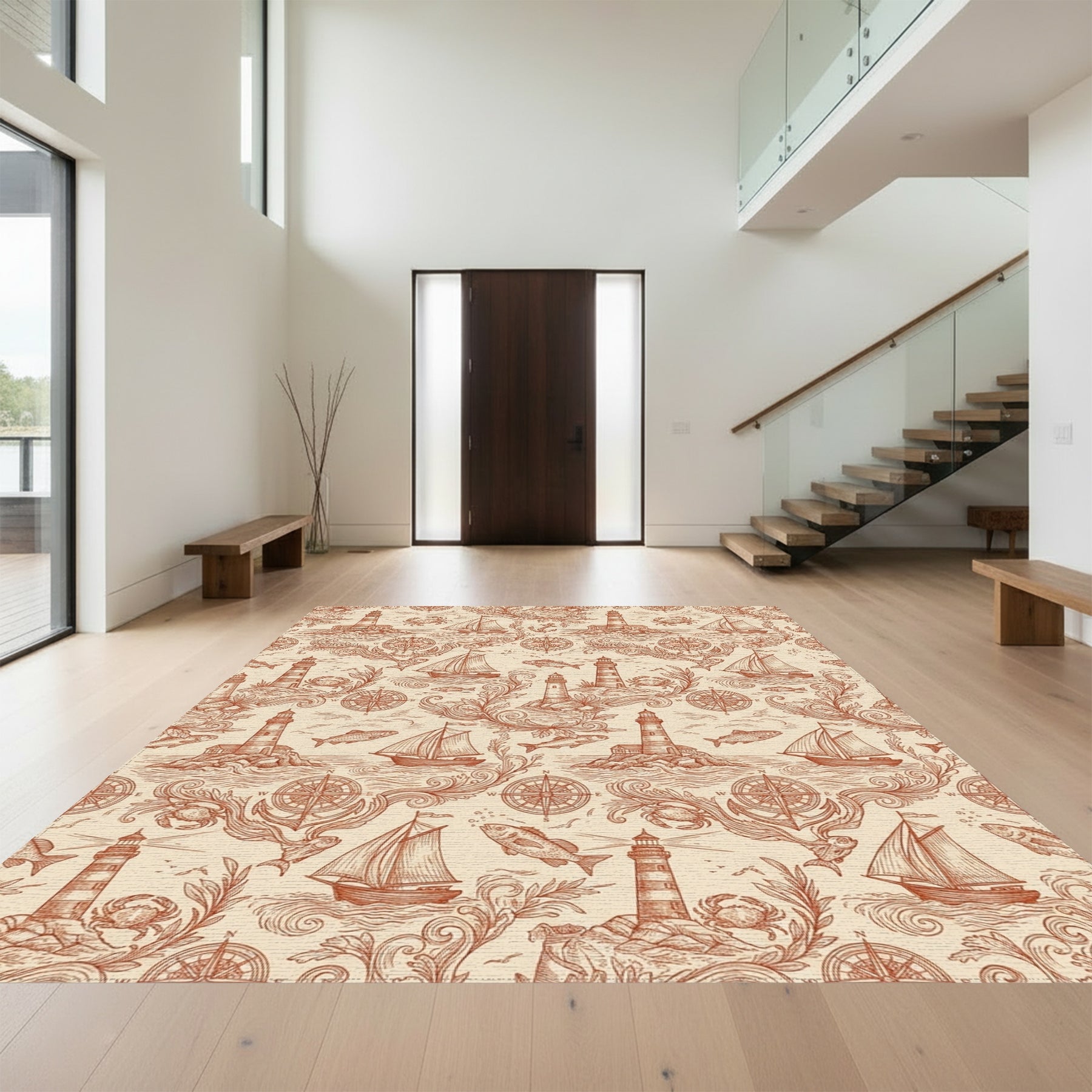 Flatwoven High Traffic Area Rug, Nautical Old World Lighthouse Sailboat Crab Rug, Non Slip, Stain Resistant, Washable Area Rugs for Living Room, Bedroom Overview: