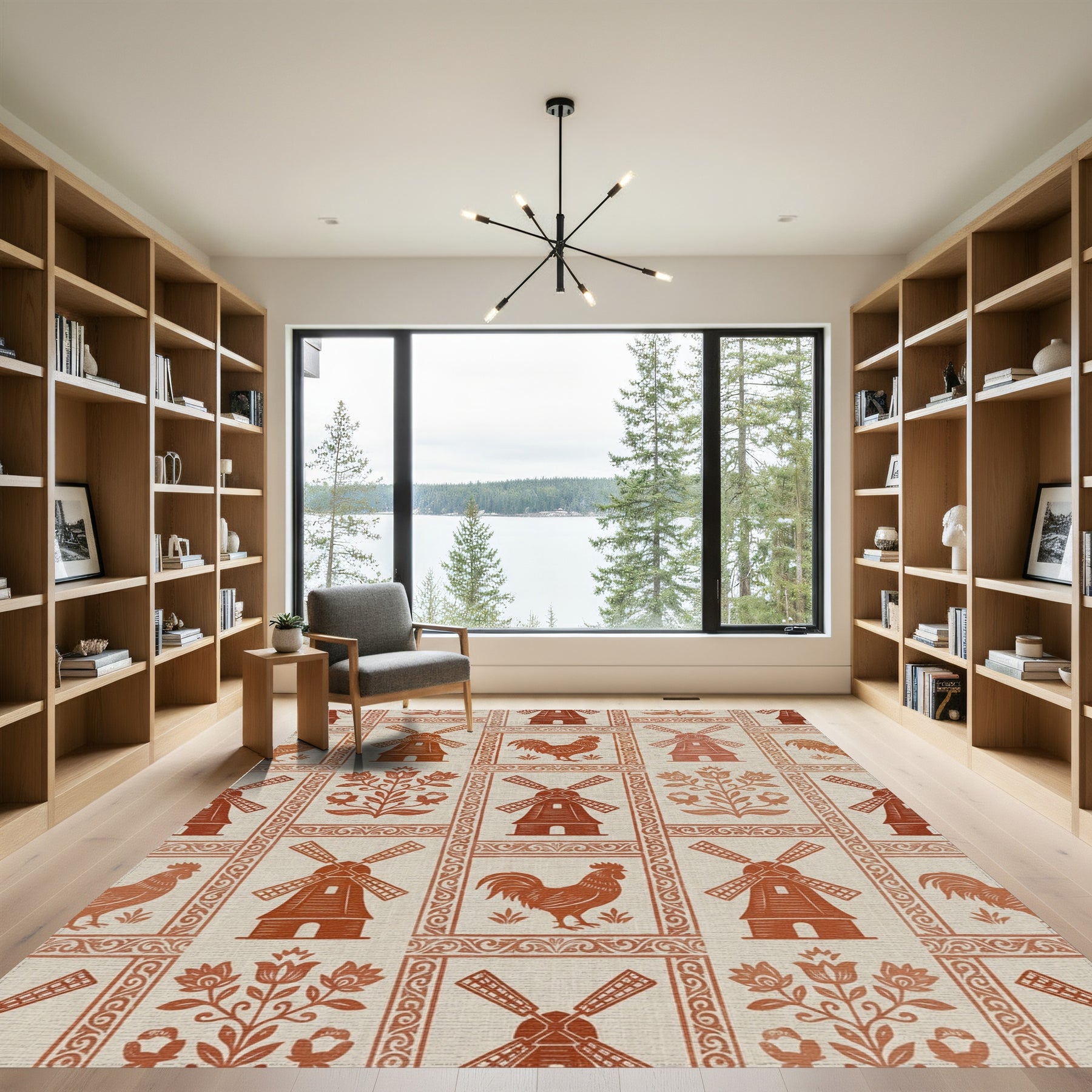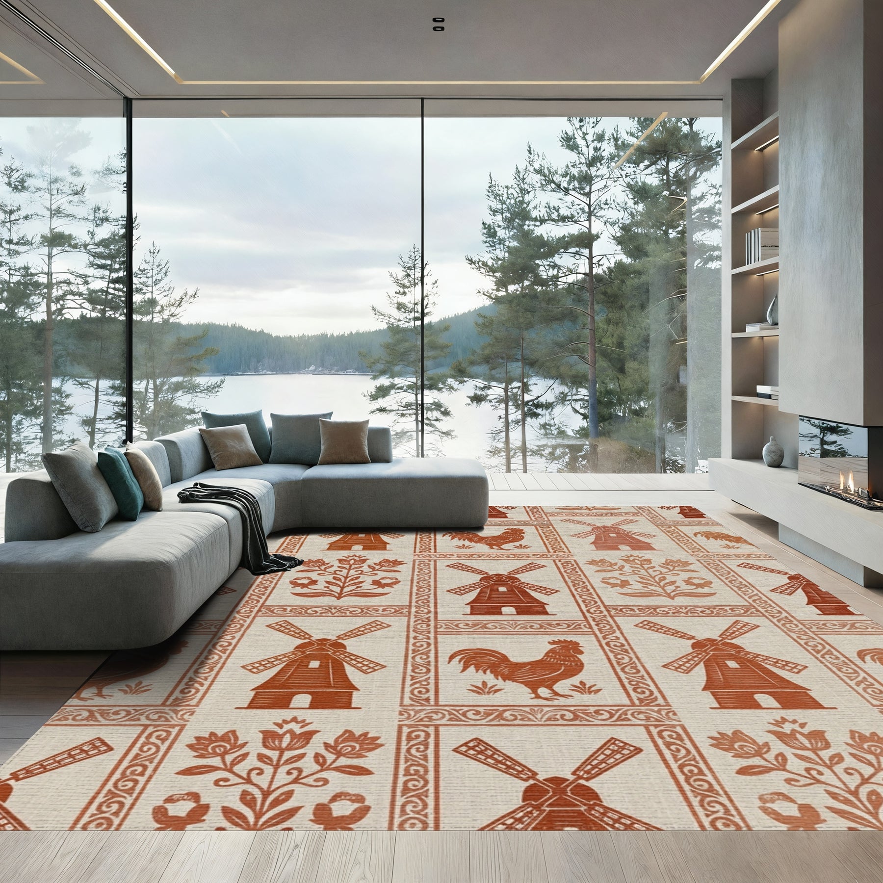 Flatwoven High Traffic Area Rug, Rustic Terra Cotta Windmills and Roosters Rug, Non Slip, Stain Resistant, Washable Area Rugs for Living Room, Bedroom Overview: