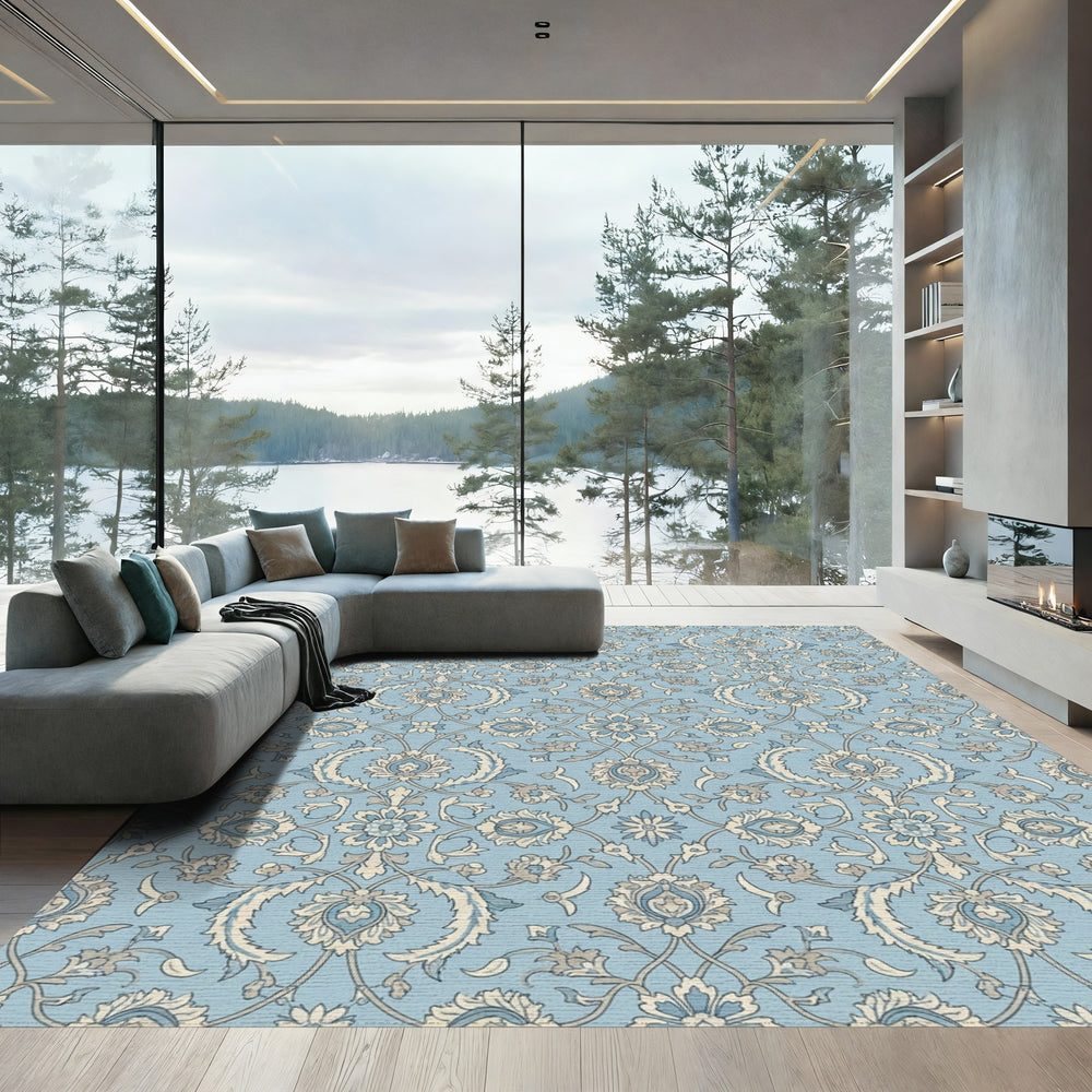 Soft Blue Floral Scrollwork Medallions Rug