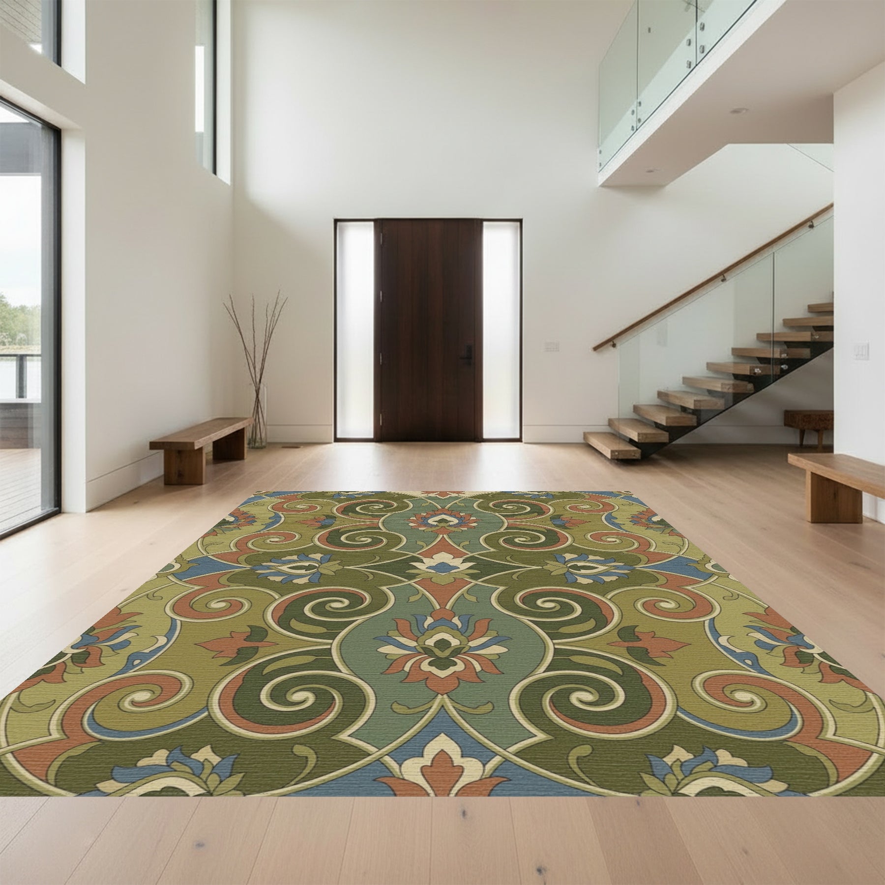 Flatwoven High Traffic Area Rug, Olive Green Floral Swirl Medallion Rug, Non Slip, Stain Resistant, Washable Area Rugs for Living Room, Bedroom Overview: