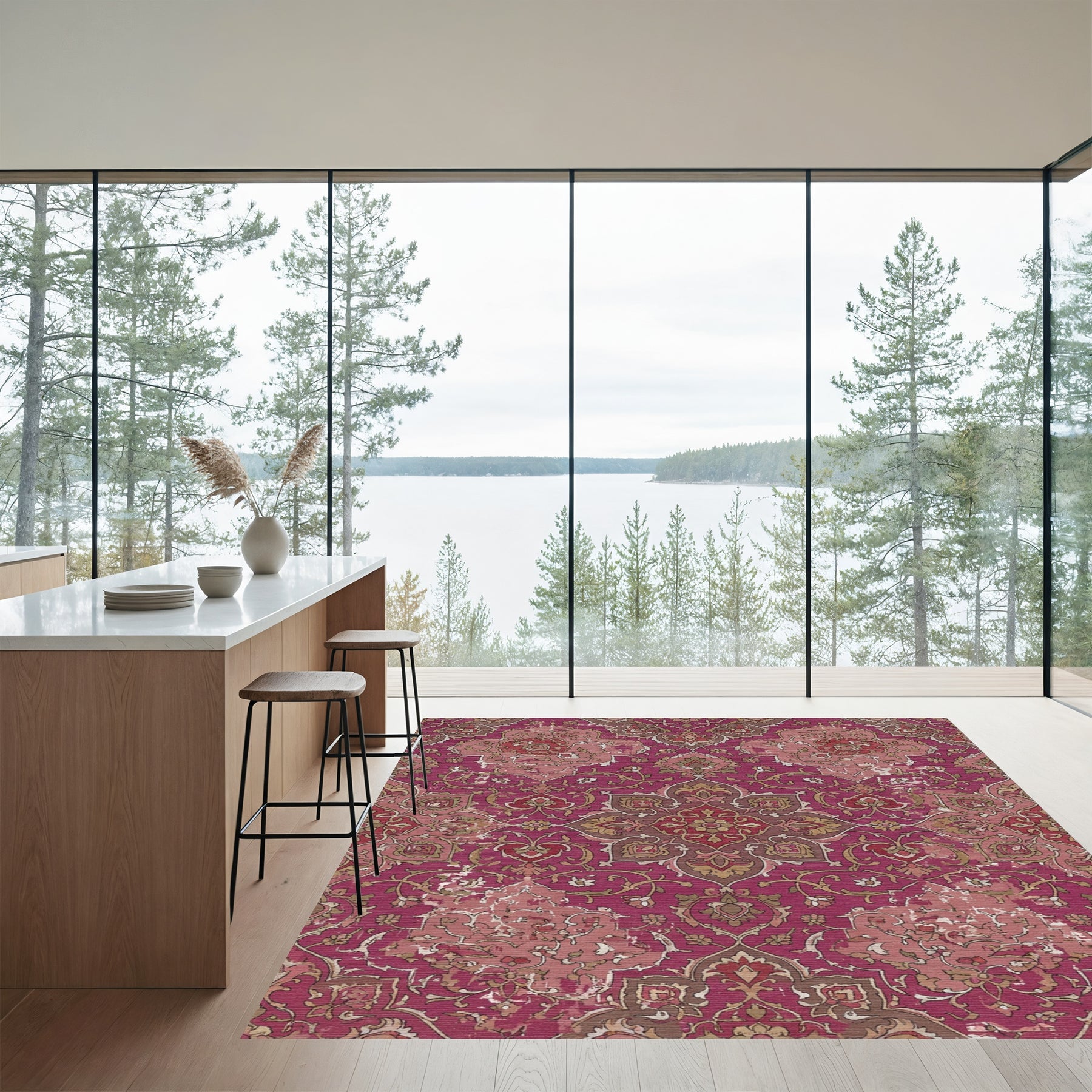 Flatwoven High Traffic Area Rug, Distressed Magenta Floral Medallion Rug, Non Slip, Stain Resistant, Washable Area Rugs for Living Room, Bedroom Overview: