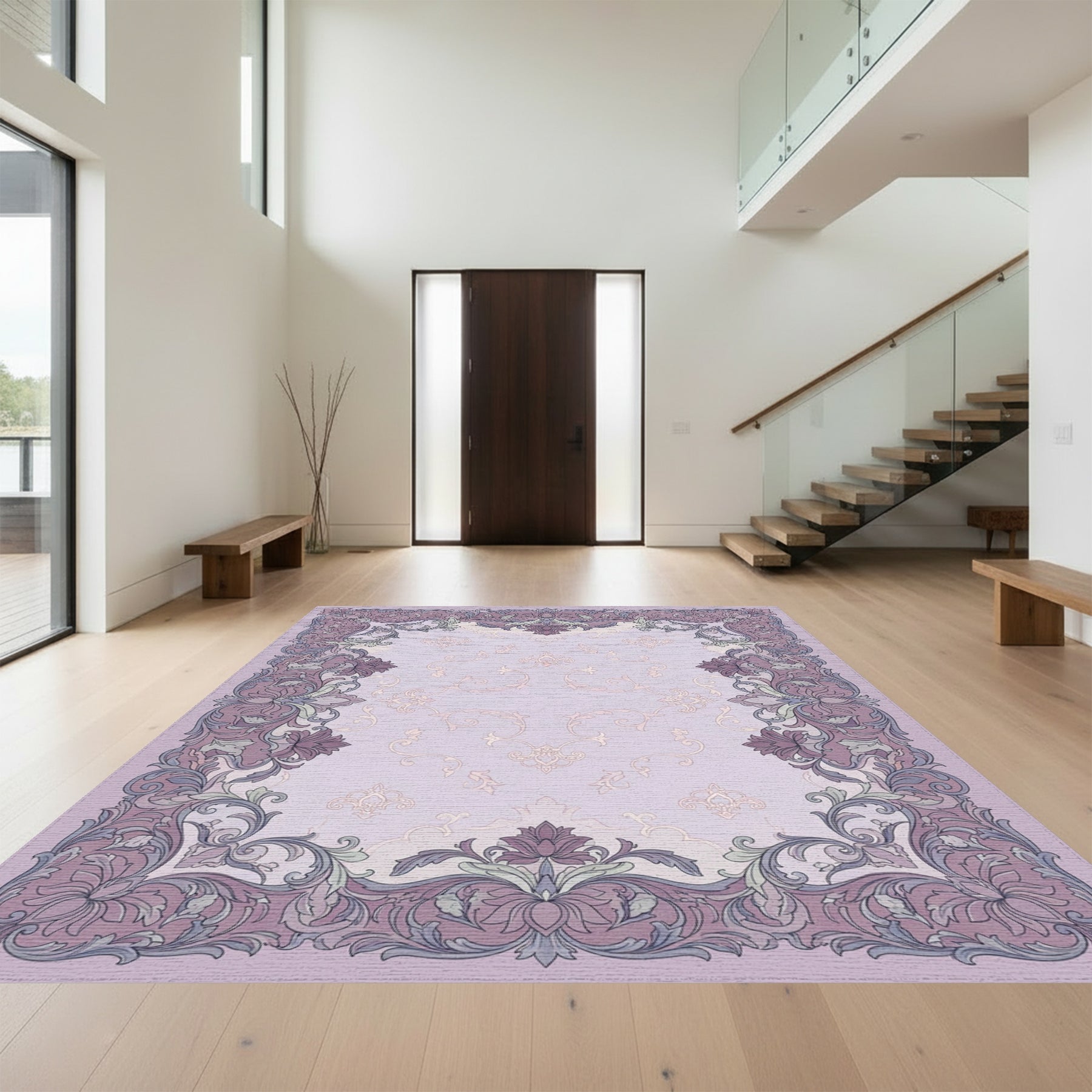 Flatwoven High Traffic Area Rug, Ornate Lavender Floral Scrollwork Rug, Non Slip, Stain Resistant, Washable Area Rugs for Living Room, Bedroom Overview: