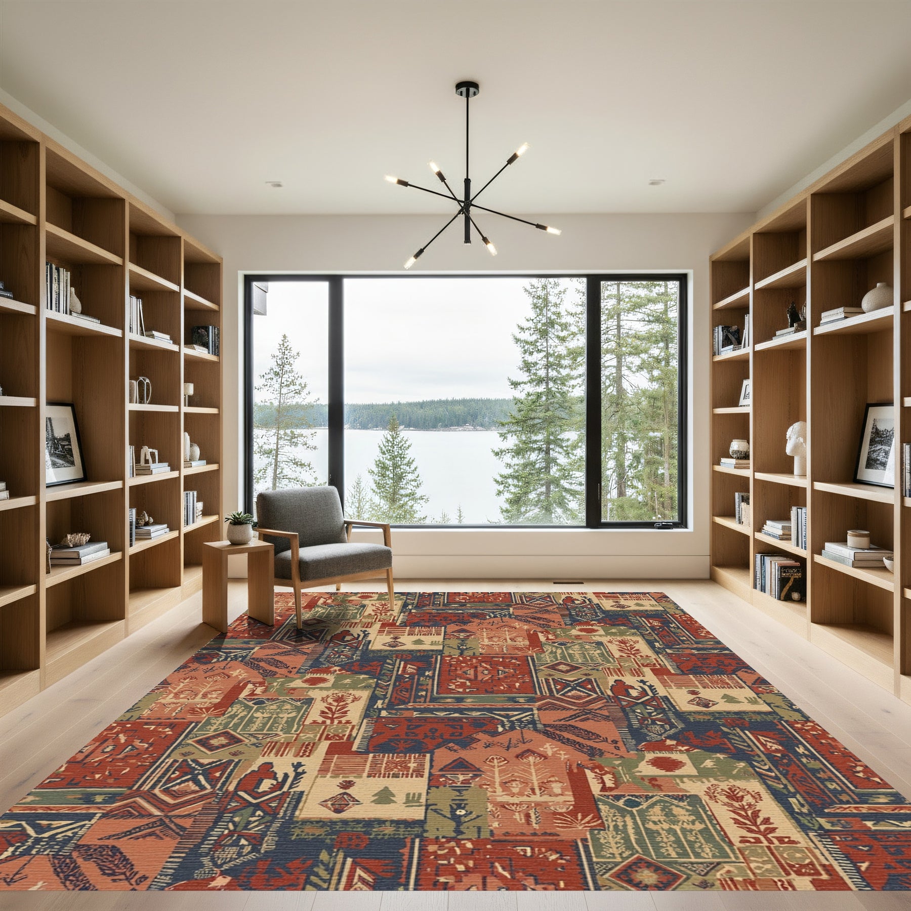 Flatwoven High Traffic Area Rug, Terracotta Navy Earthy Patchwork Medallion Rug, Non Slip, Stain Resistant, Washable Area Rugs for Living Room, Bedroom Overview: