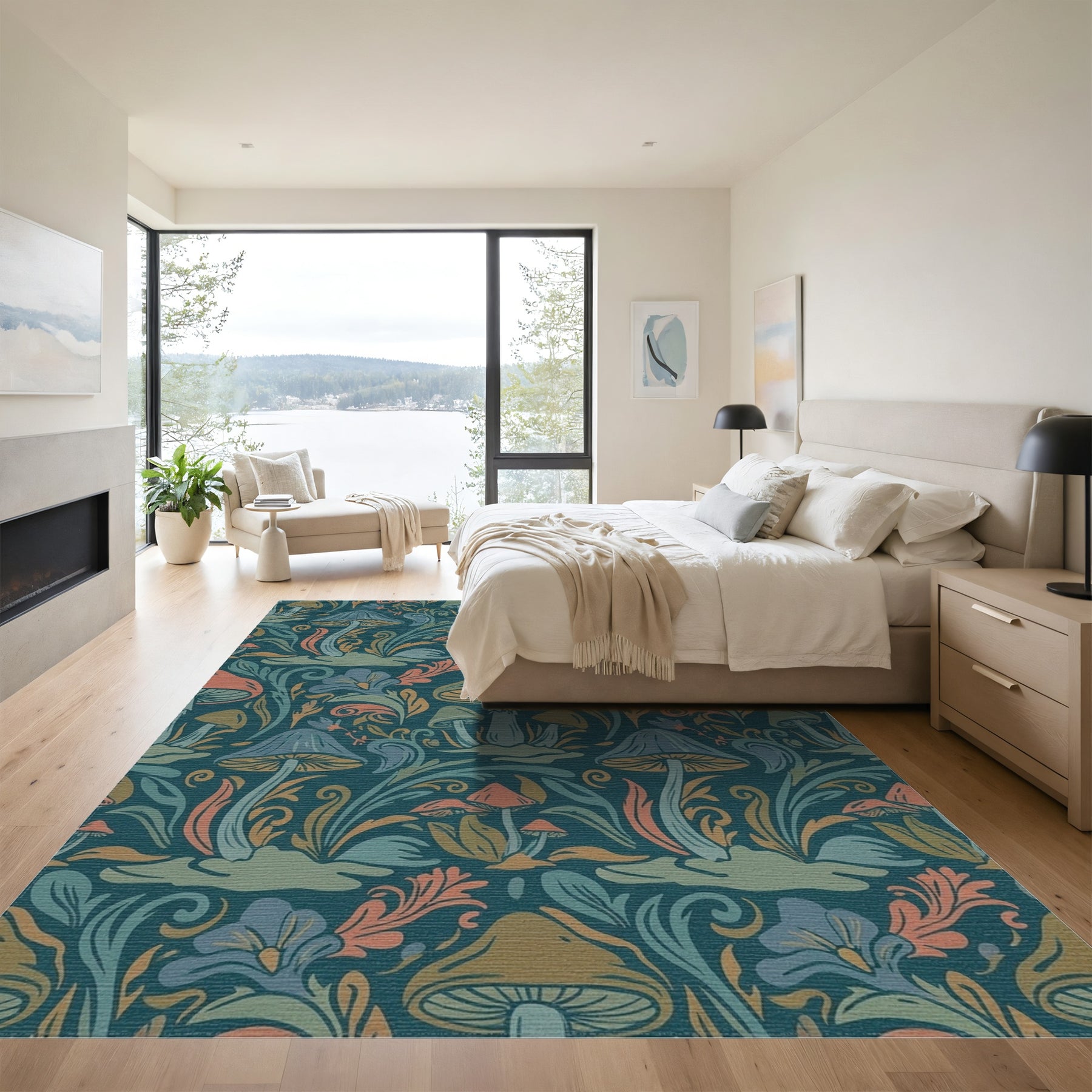 Flatwoven High Traffic Area Rug, Deep Teal Mushroom Botanical Swirl Rug, Non Slip, Stain Resistant, Washable Area Rugs for Living Room, Bedroom Overview: