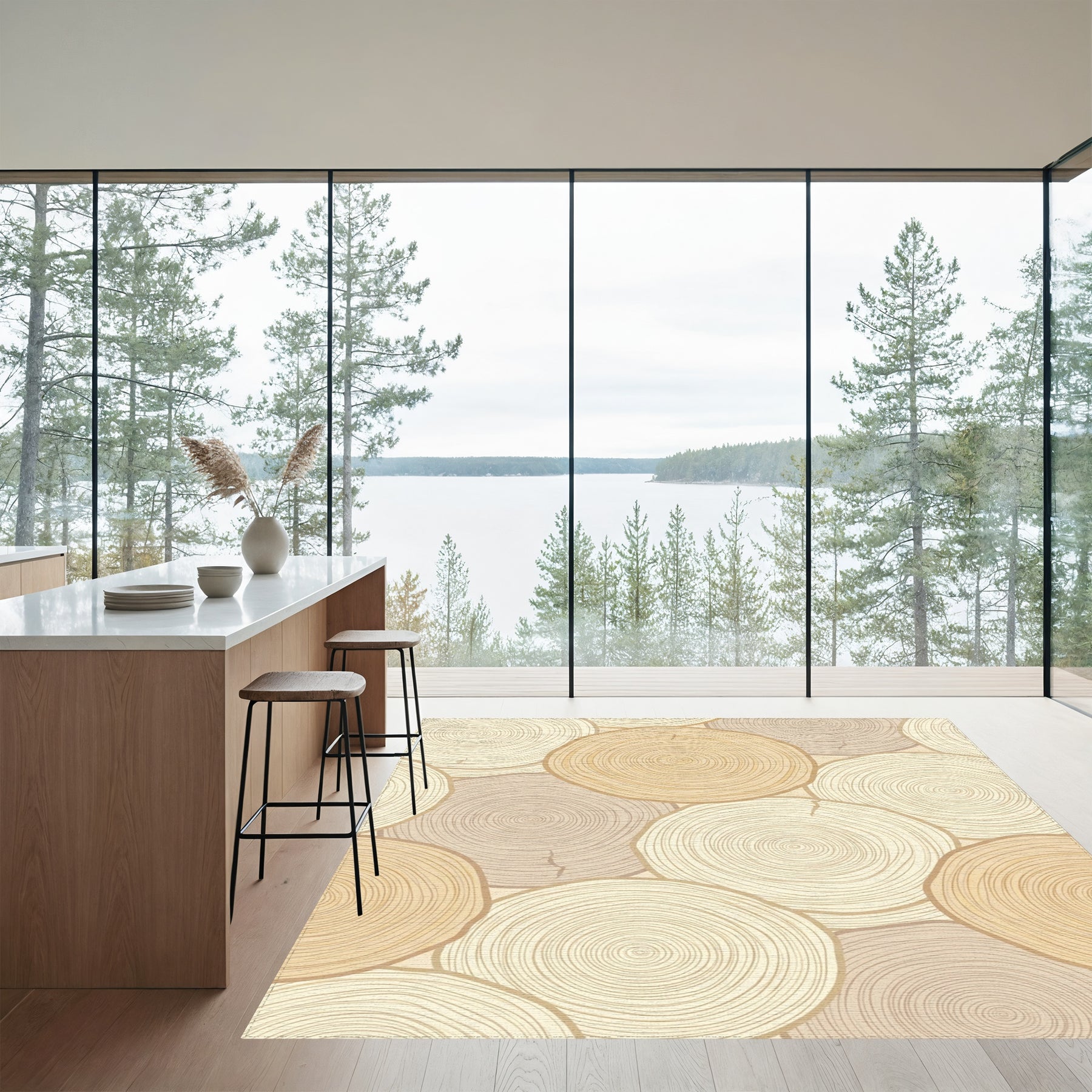 Flatwoven High Traffic Area Rug, Neutral Wood Slice Rings Rug, Non Slip, Stain Resistant, Washable Area Rugs for Living Room, Bedroom Overview: