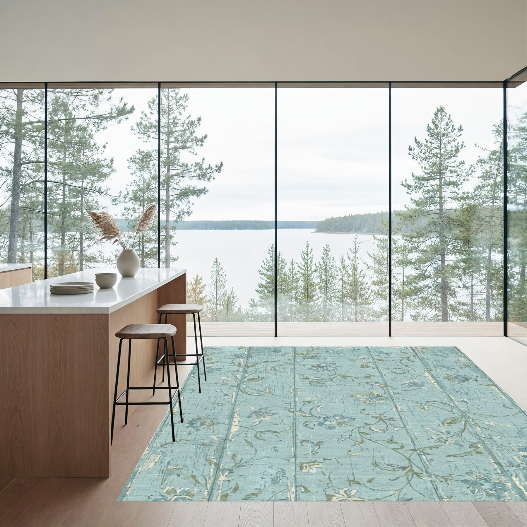 Flatwoven High Traffic Area Rug, Distressed Aqua Floral Vine Wood Grain Rug, Non Slip, Stain Resistant, Washable Area Rugs for Living Room, Bedroom Overview: