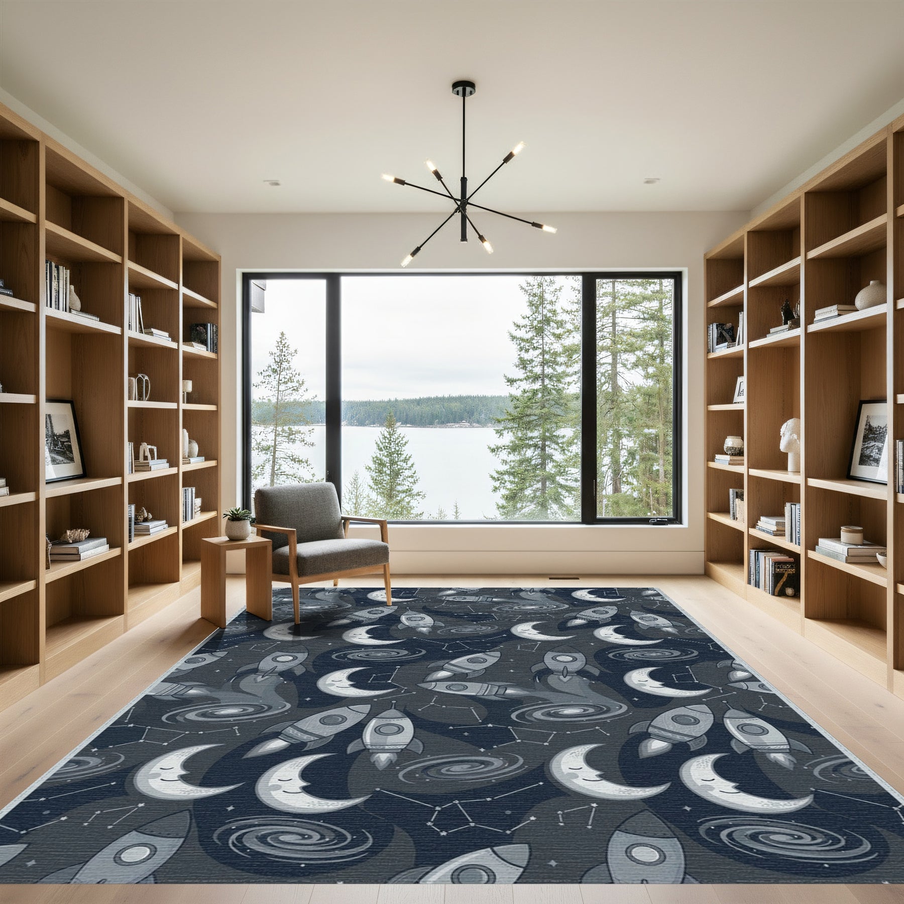 Flatwoven High Traffic Area Rug, Outer Space Rocket Moon Constellation Rug, Non Slip, Stain Resistant, Washable Area Rugs for Living Room, Bedroom Overview: