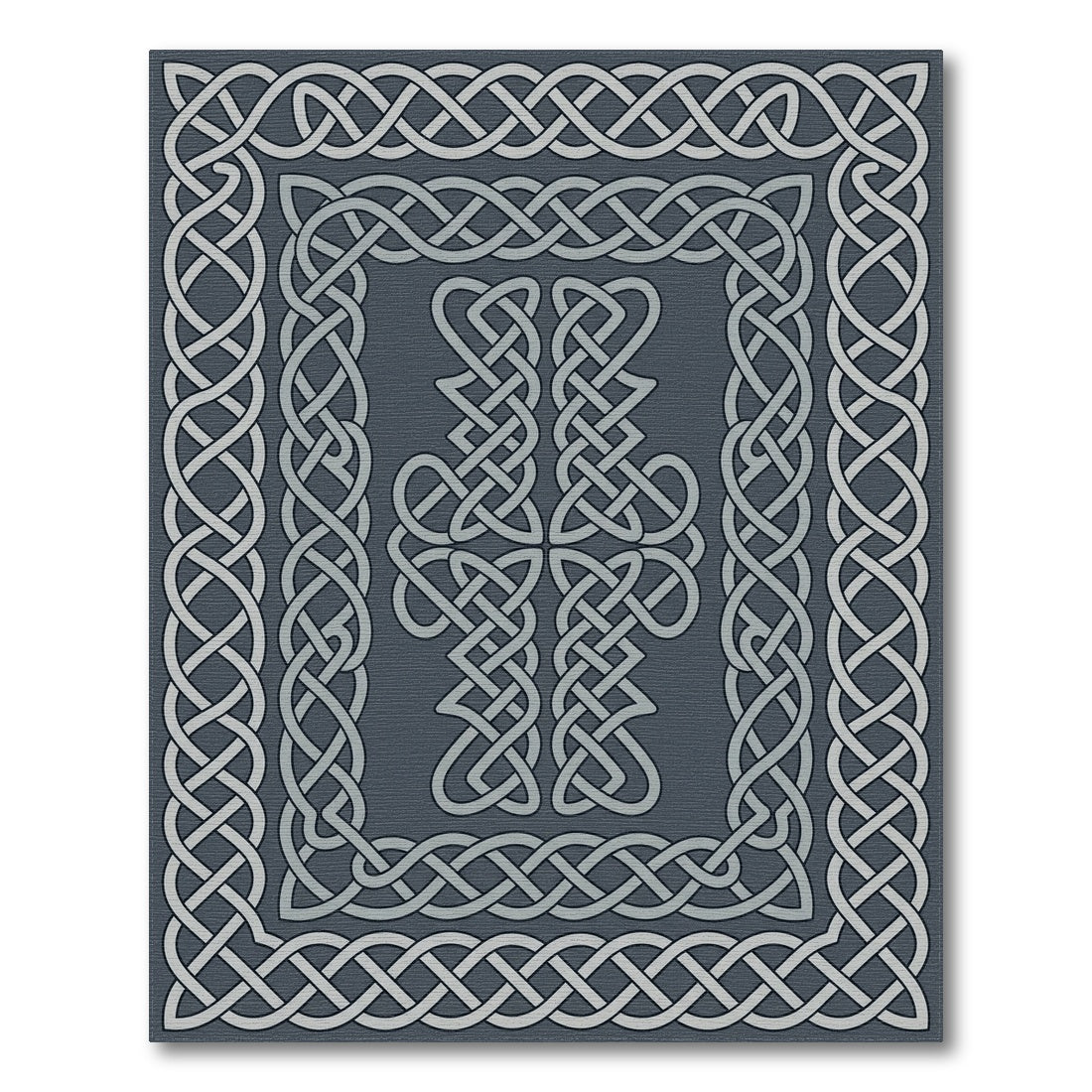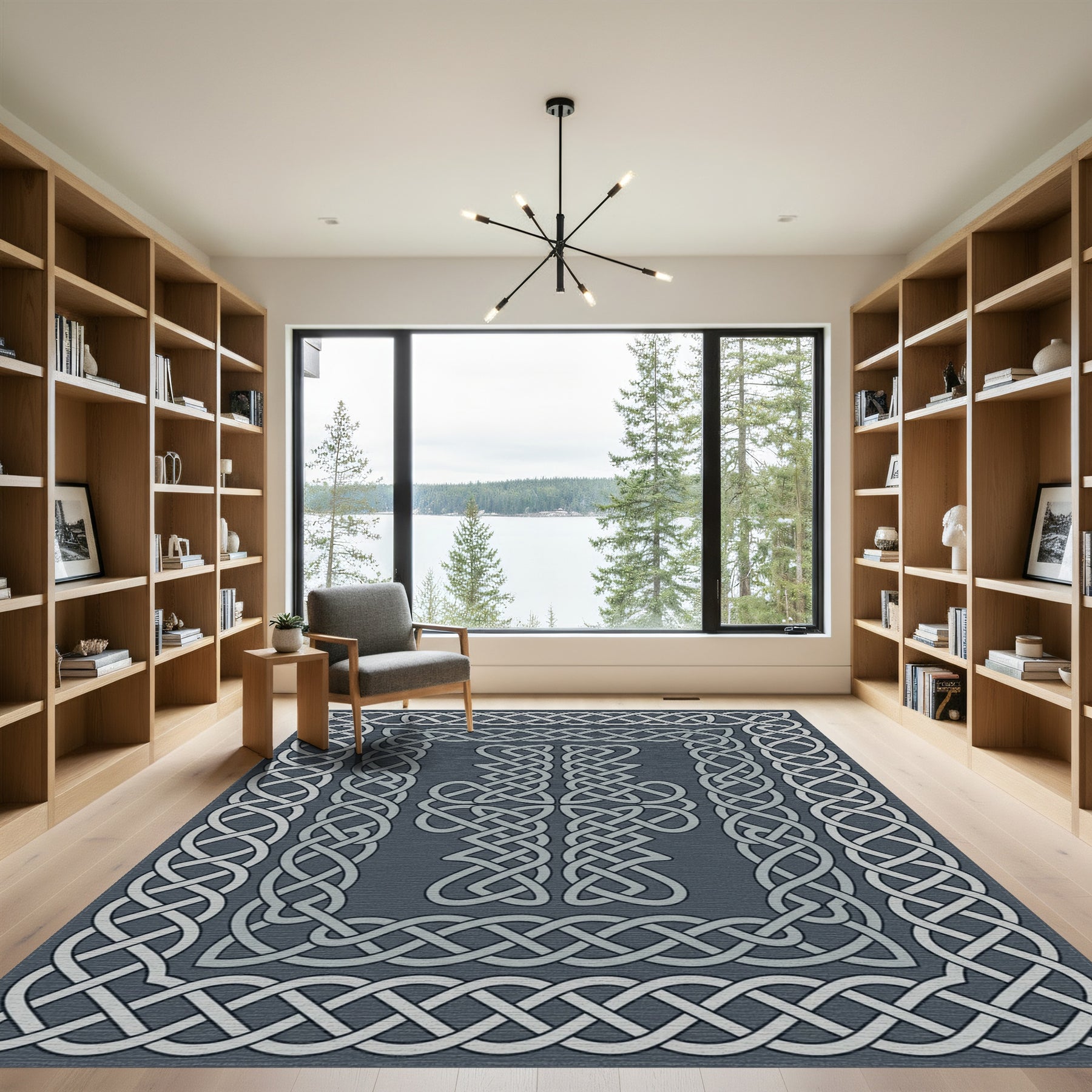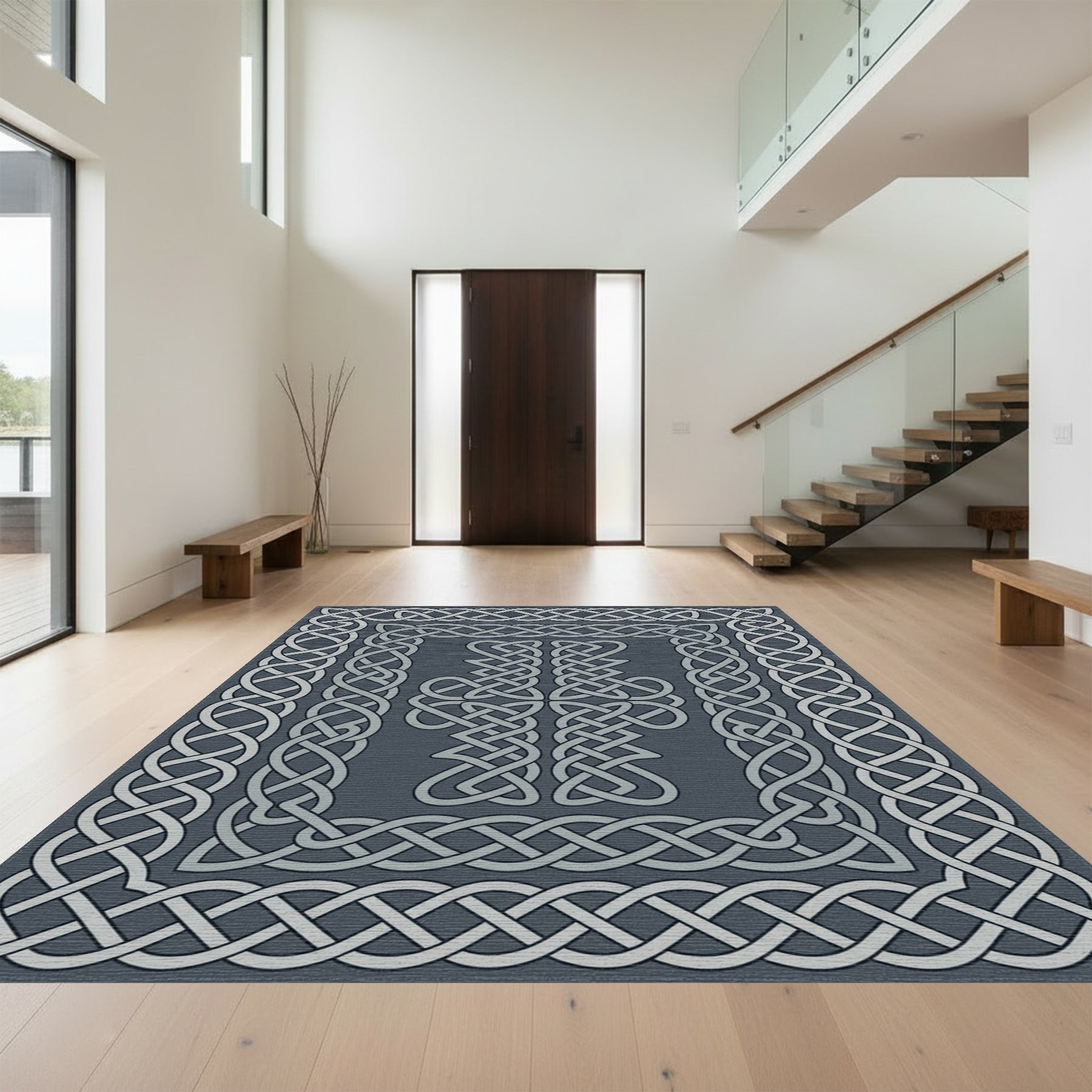 Flatwoven High Traffic Area Rug, Silver Celtic Knot Border Rug, Non Slip, Stain Resistant, Washable Area Rugs for Living Room, Bedroom Overview: