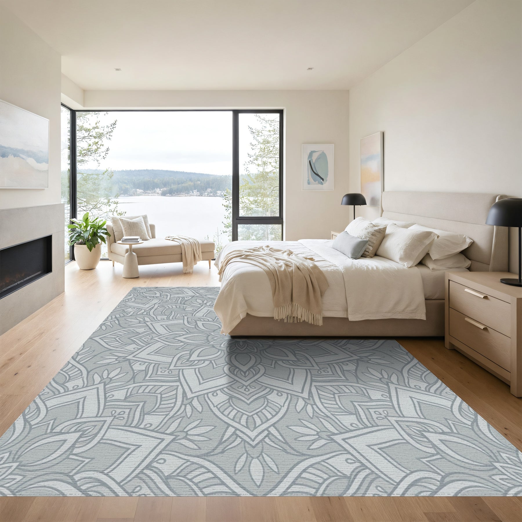 Flatwoven High Traffic Area Rug, Soft Gray Intricate Mandala Bloom Rug, Non Slip, Stain Resistant, Washable Area Rugs for Living Room, Bedroom Overview: