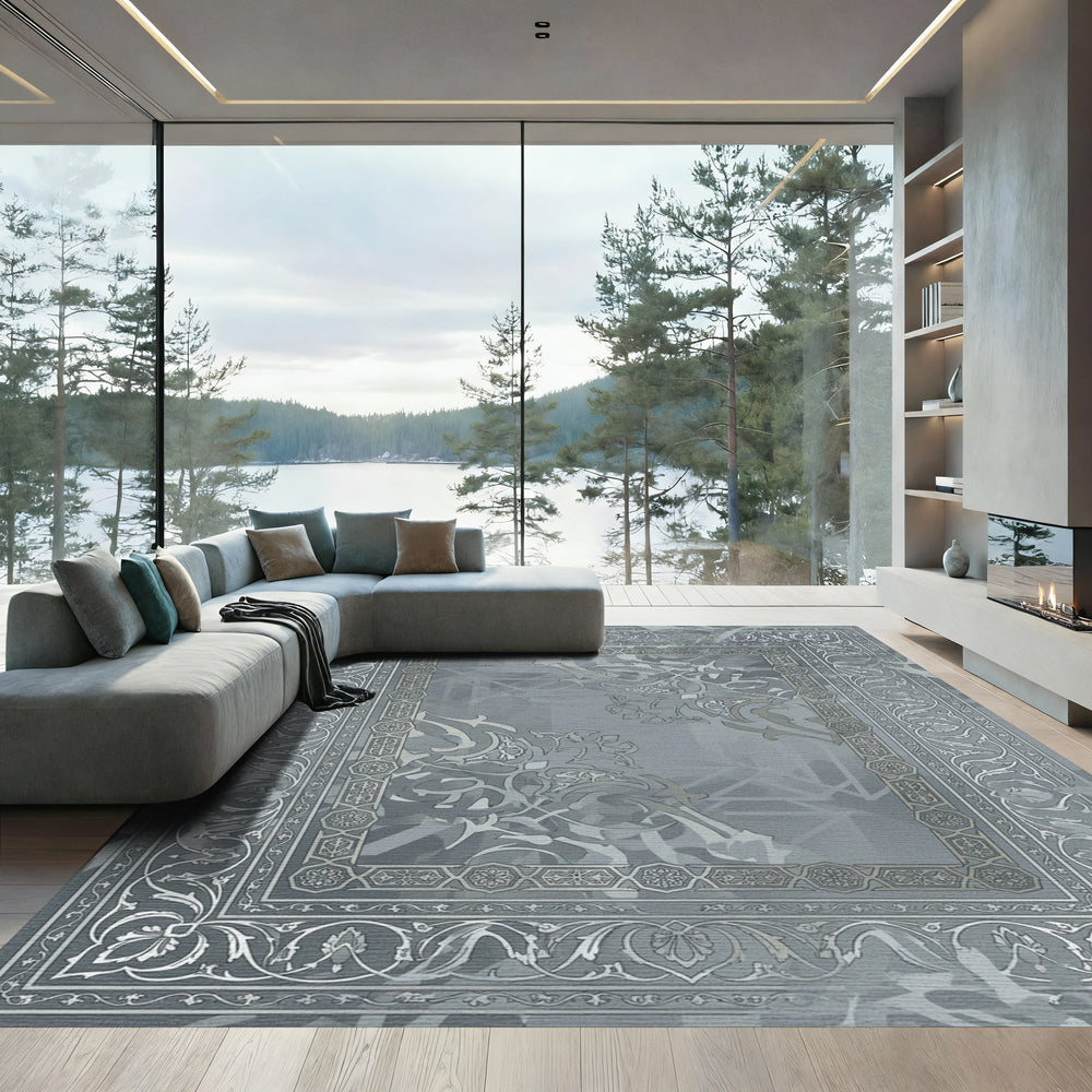 Classic Gray Ornate Floral Border Rug