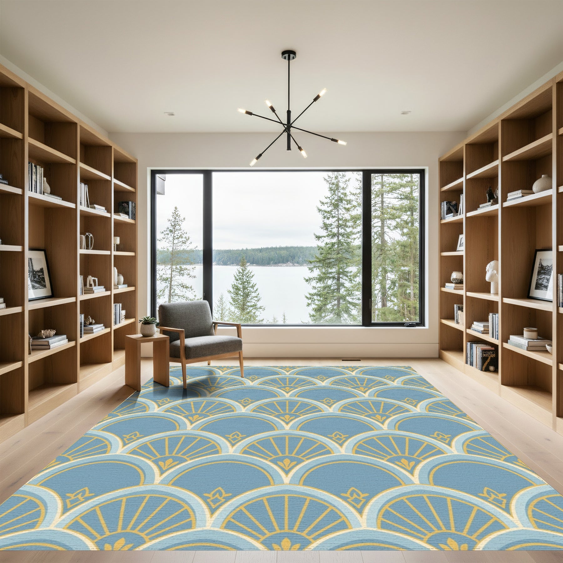 Flatwoven High Traffic Area Rug, Blue Yellow Fan Arch Geometric Rug, Non Slip, Stain Resistant, Washable Area Rugs for Living Room, Bedroom Overview: