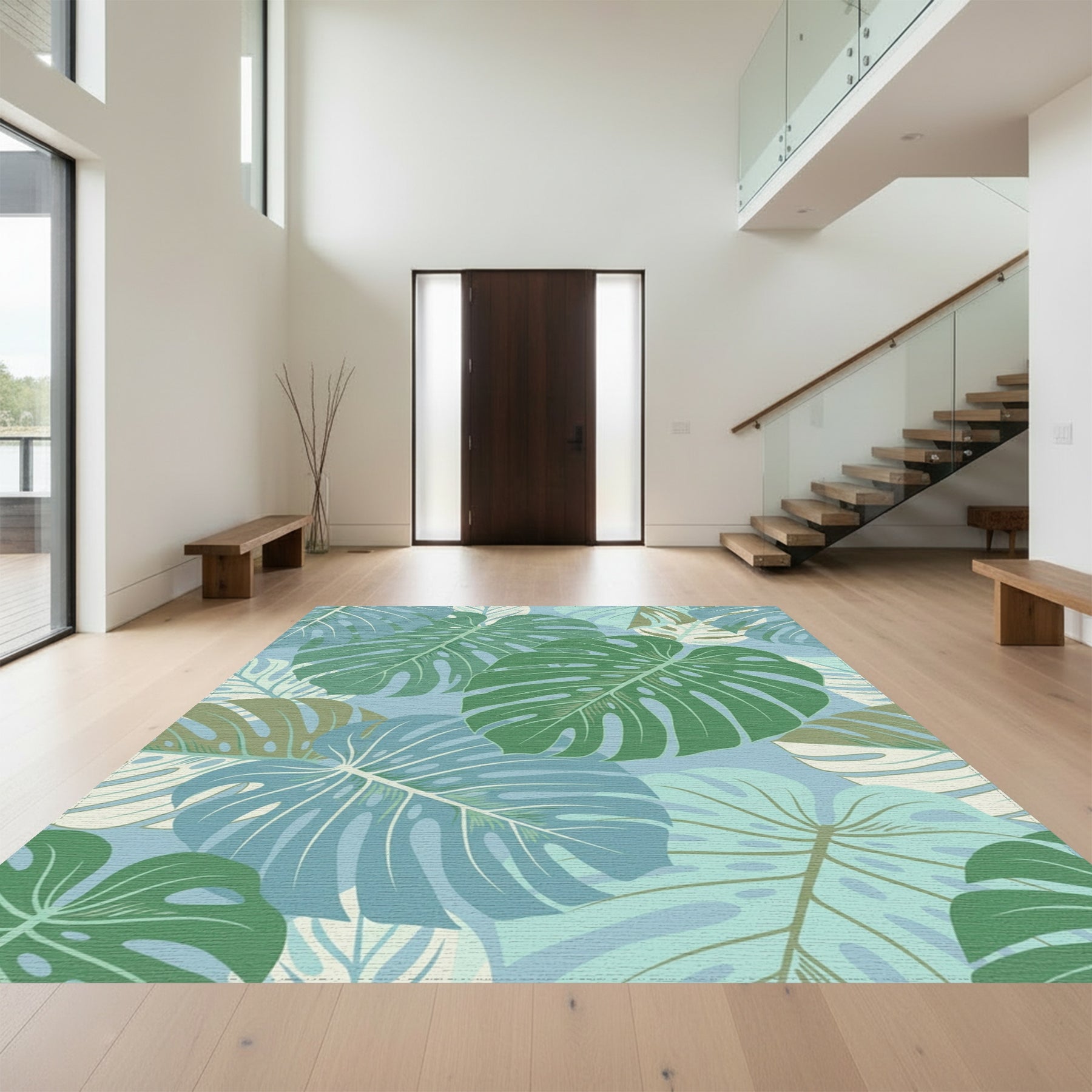 Flatwoven High Traffic Area Rug, Muted Teal Monstera Leaf Collage Rug, Non Slip, Stain Resistant, Washable Area Rugs for Living Room, Bedroom Overview: