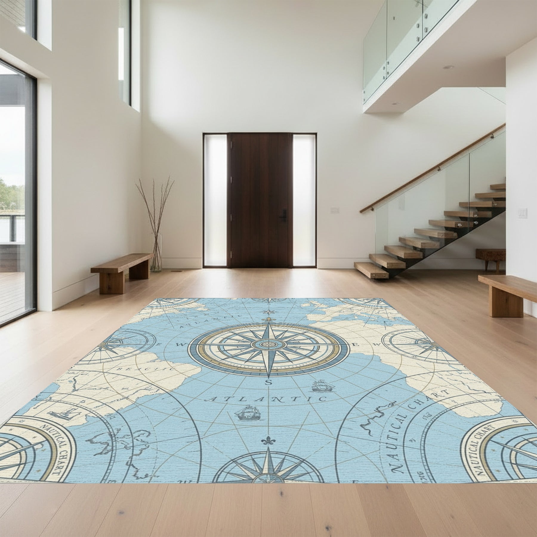 Flatwoven High Traffic Area Rug, Nautical Compass Rose Atlantic Map Rug, Non Slip, Stain Resistant, Washable Area Rugs for Living Room, Bedroom Overview: