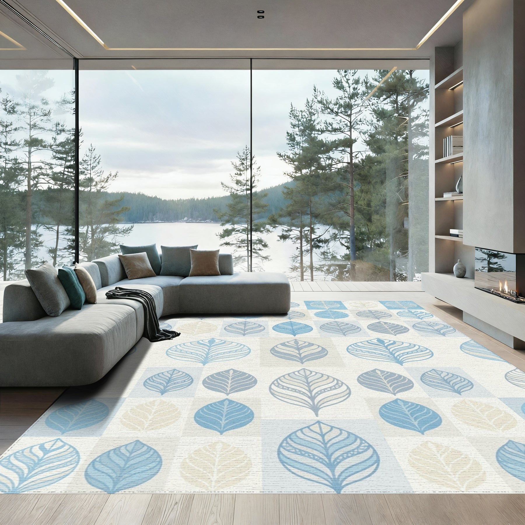 Soft Blue Leaf Botanical Squares Rug