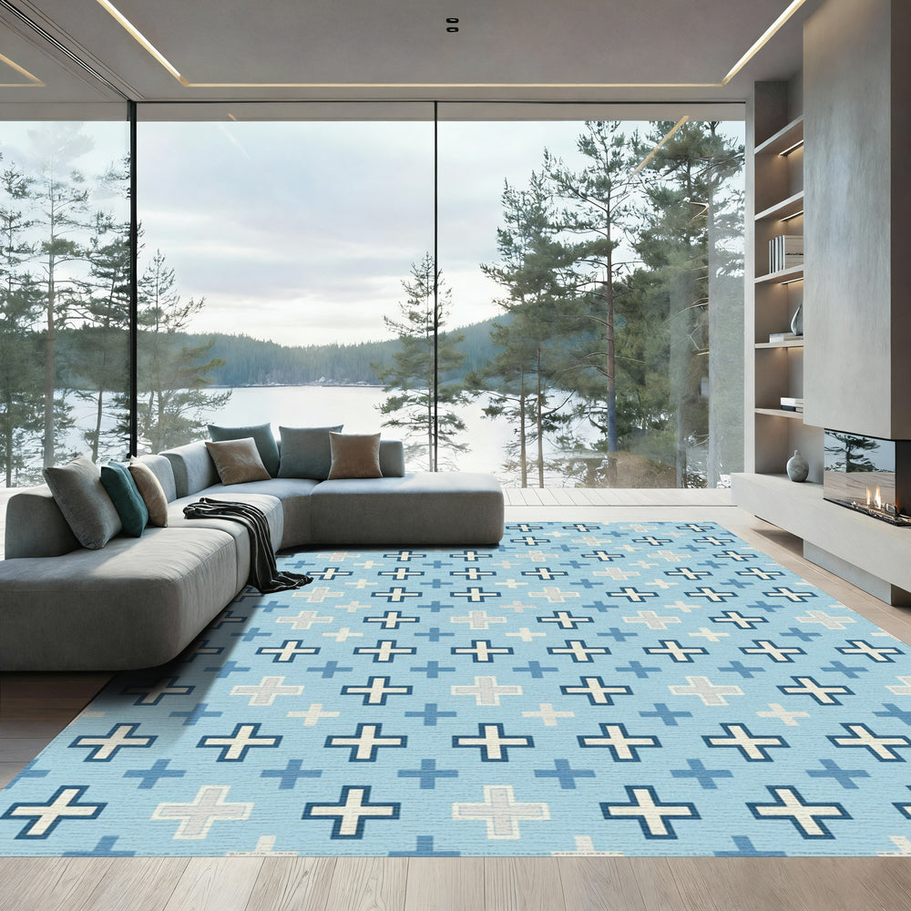 Sky Blue Cross Geometric Tile Rug