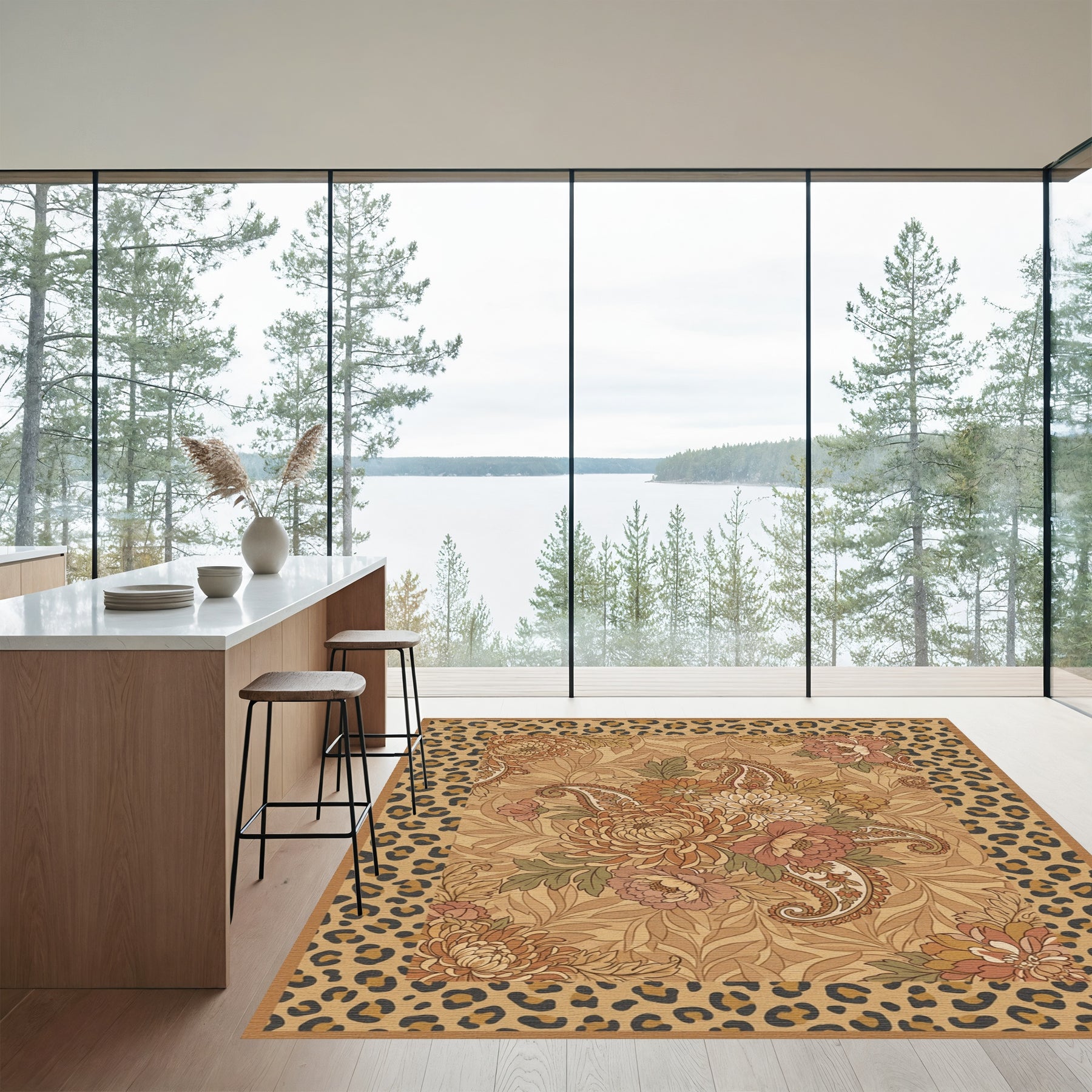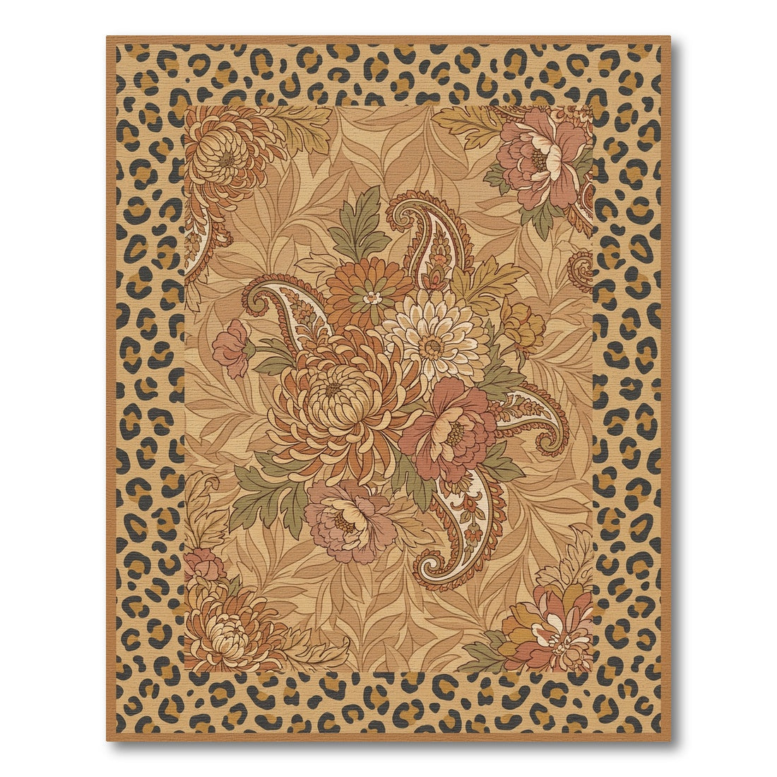Flatwoven High Traffic Area Rug, Earthy Floral Paisley Leopard Border Rug, Non Slip, Stain Resistant, Washable Area Rugs for Living Room, Bedroom Overview: