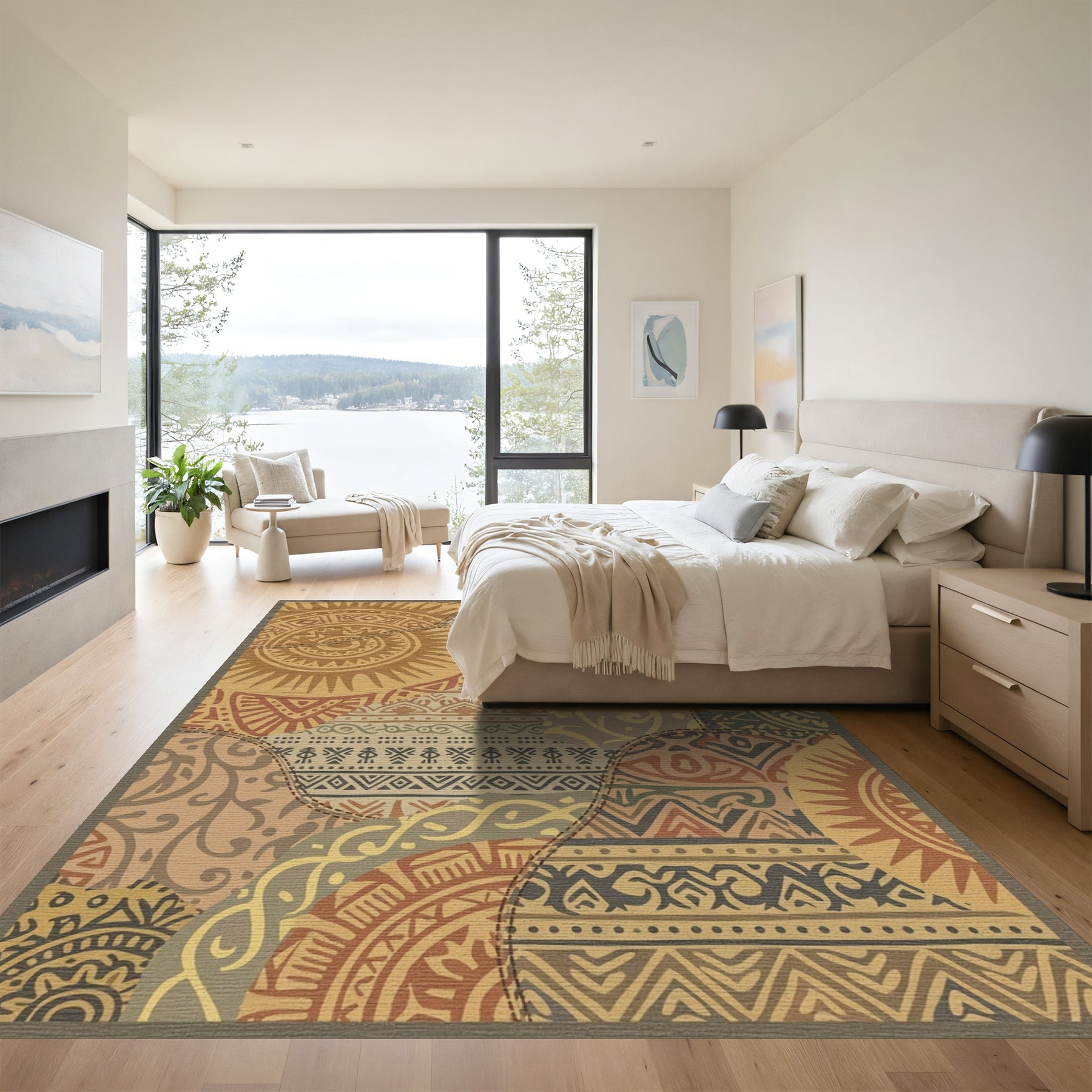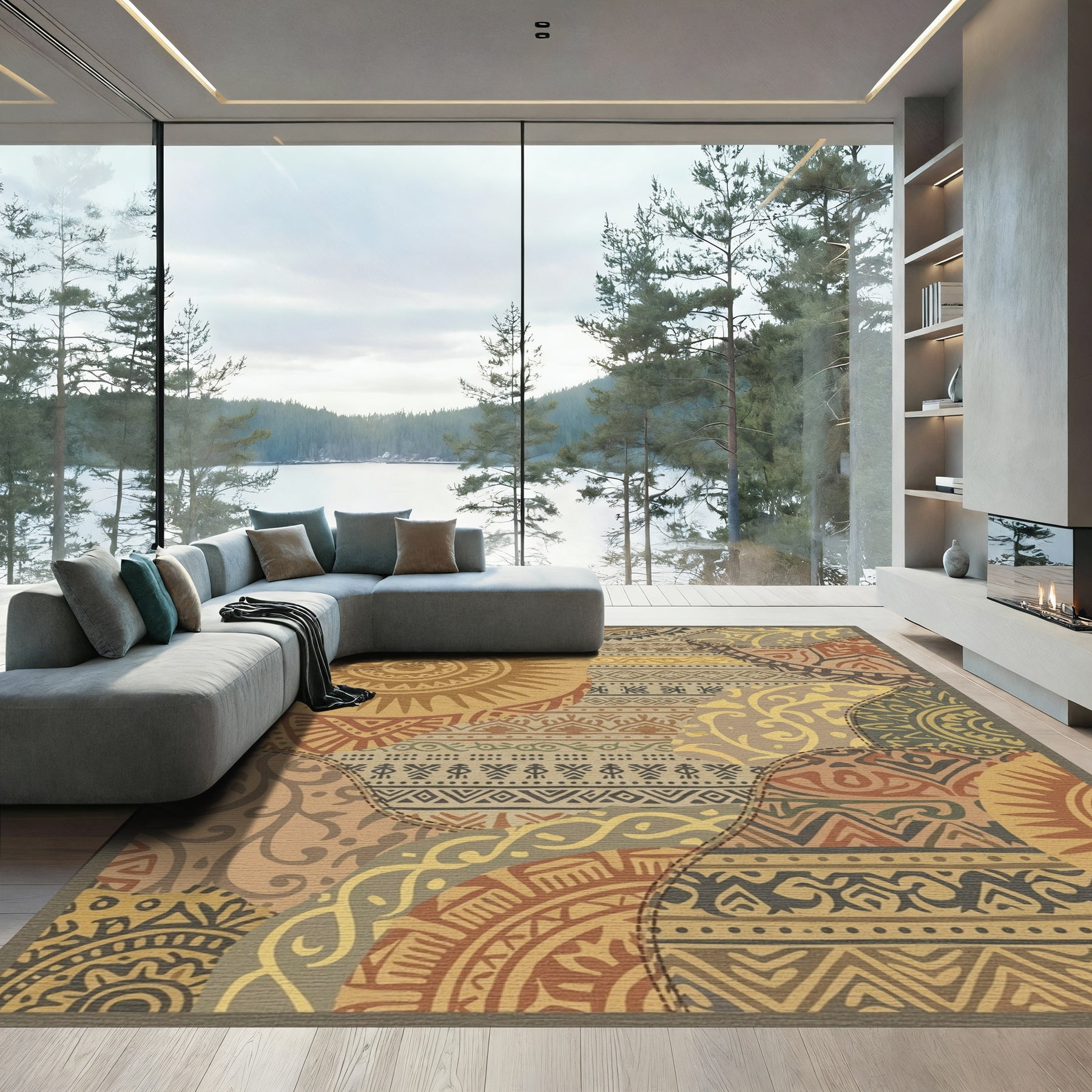 Flatwoven High Traffic Area Rug, Terracotta Earth Tones Patchwork Medallions Rug, Non Slip, Stain Resistant, Washable Area Rugs for Living Room, Bedroom Overview: