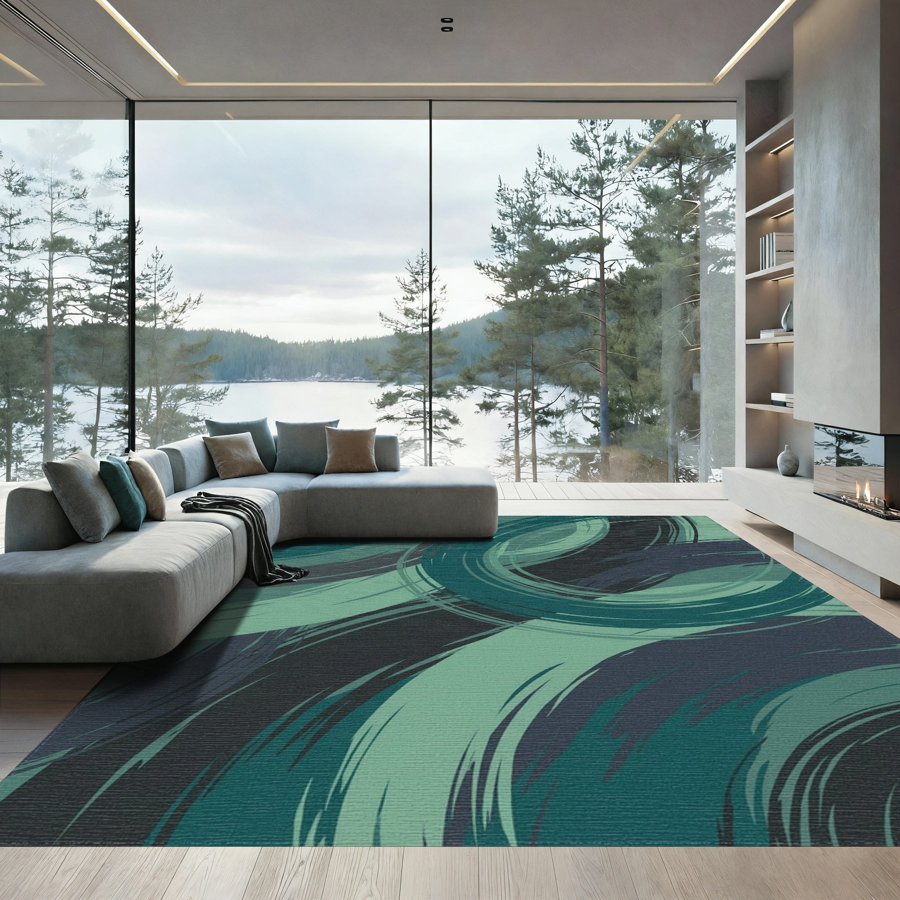 Flatwoven High Traffic Area Rug, Deep Teal Swirl Abstract Brushstrokes Rug, Non Slip, Stain Resistant, Washable Area Rugs for Living Room, Bedroom Overview: