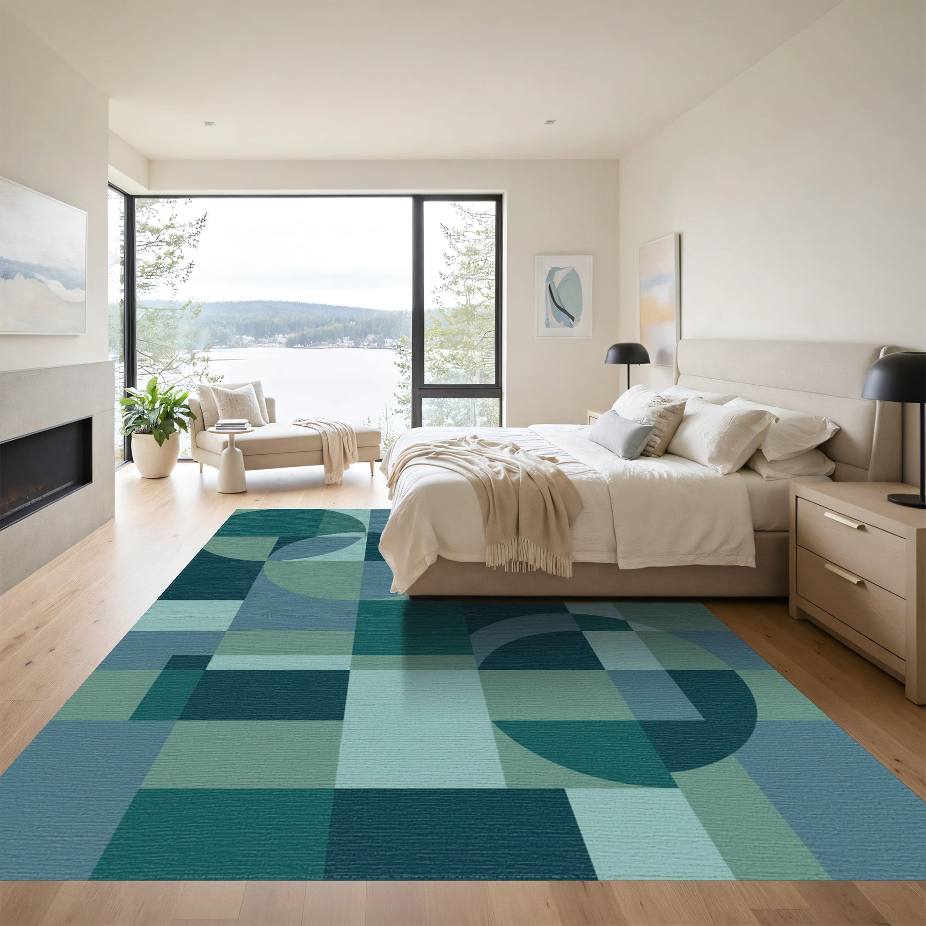 Flatwoven High Traffic Area Rug, Teal Abstract Geometric Circle Squares Rug, Non Slip, Stain Resistant, Washable Area Rugs for Living Room, Bedroom Overview: