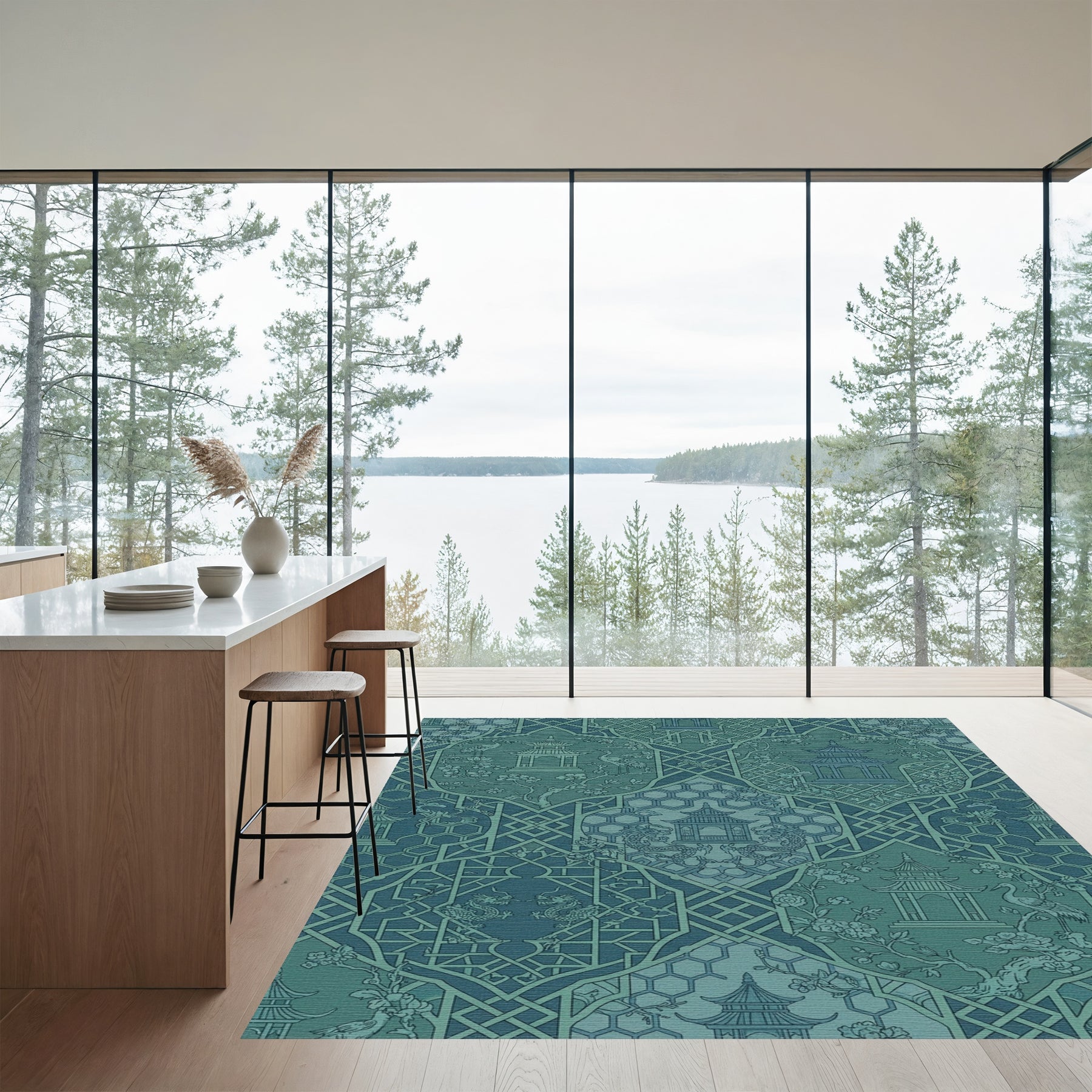 Flatwoven High Traffic Area Rug, Teal Pagoda Dragon Blossom Lattice Rug, Non Slip, Stain Resistant, Washable Area Rugs for Living Room, Bedroom Overview: