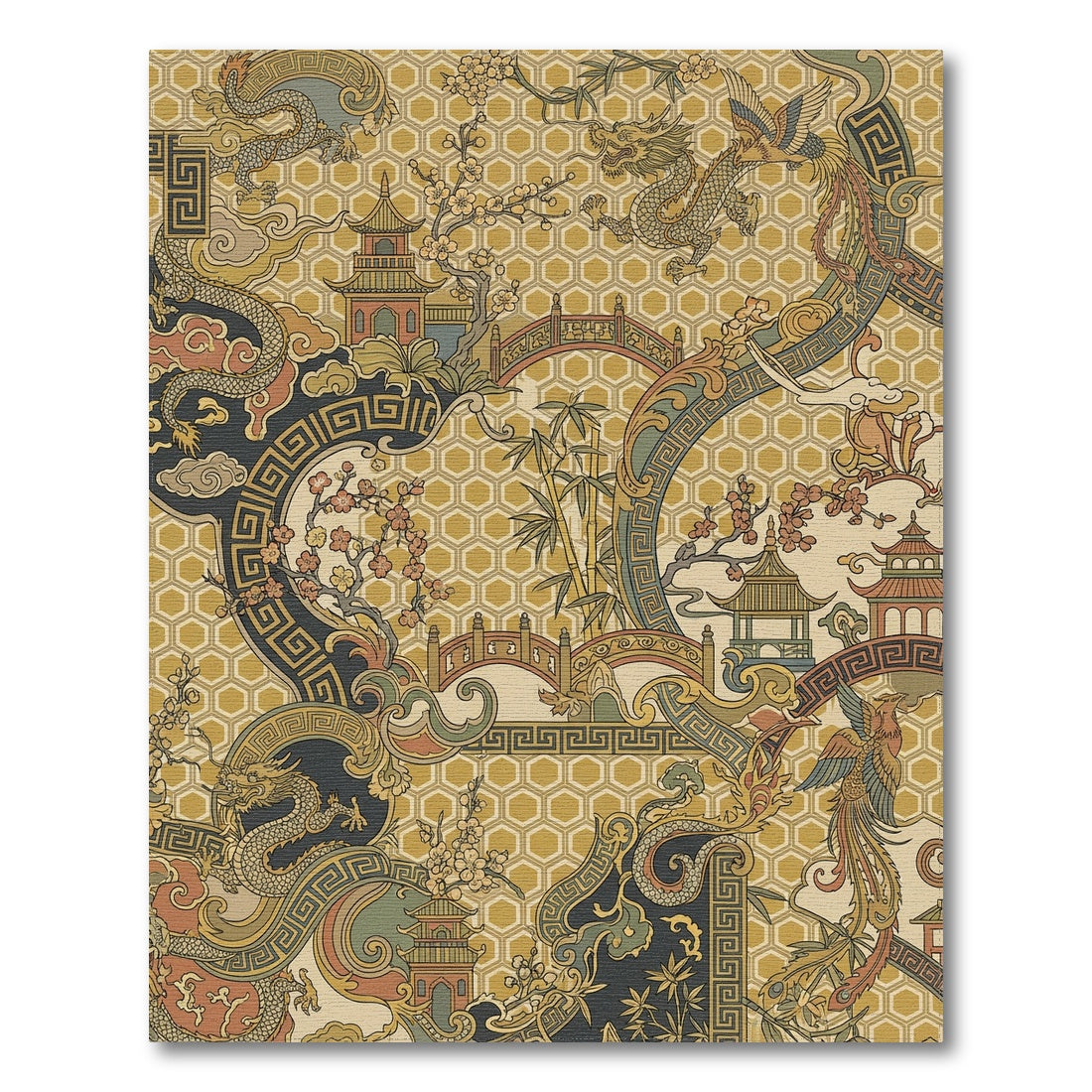 Flatwoven High Traffic Area Rug, Golden Dragon Phoenix Pagoda Landscape Rug, Non Slip, Stain Resistant, Washable Area Rugs for Living Room, Bedroom Overview:
