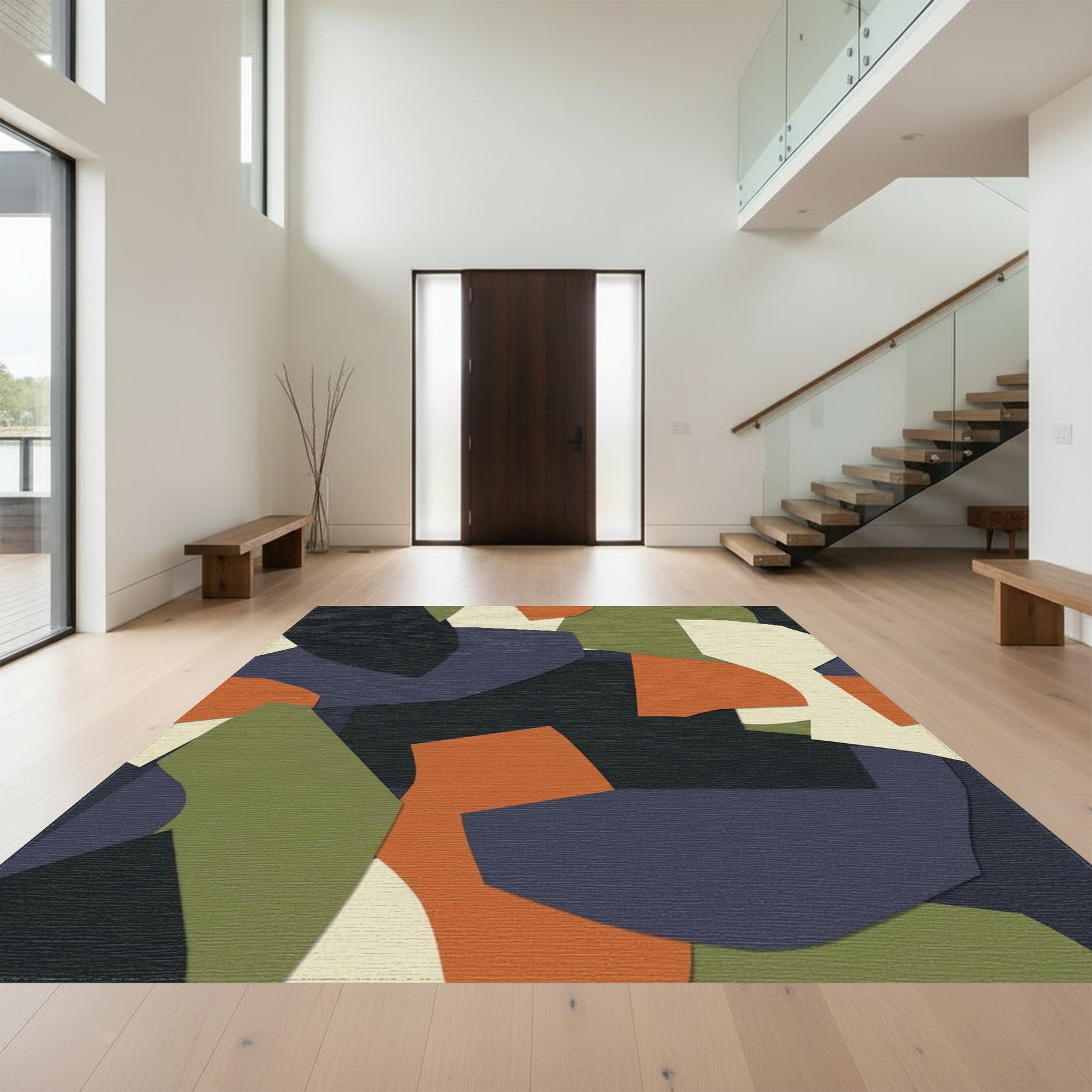 Flatwoven High Traffic Area Rug, Abstract Ochre Olive Geometric Layered Rug, Non Slip, Stain Resistant, Washable Area Rugs for Living Room, Bedroom Overview:
